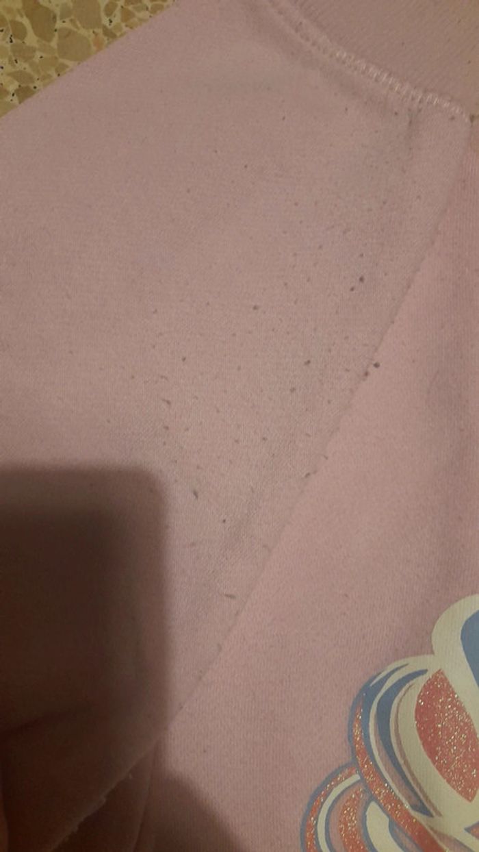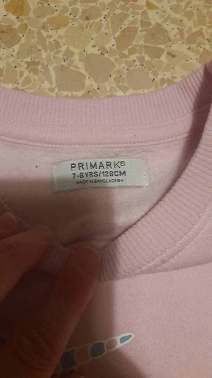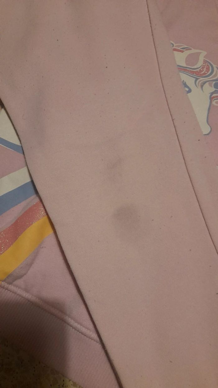 Jogging sweet motifs licorne, rose, haut taille 7/8 ans, bas taille 6/7ans. Le pantalon a un petite tache genou droit, et ensemble a un peu de bouloches
