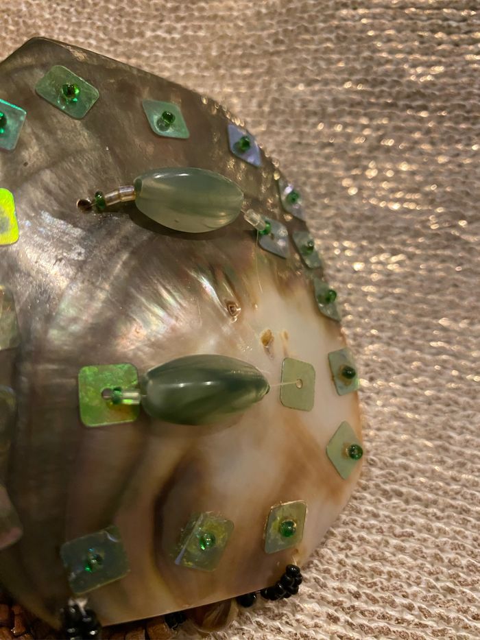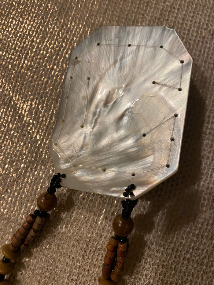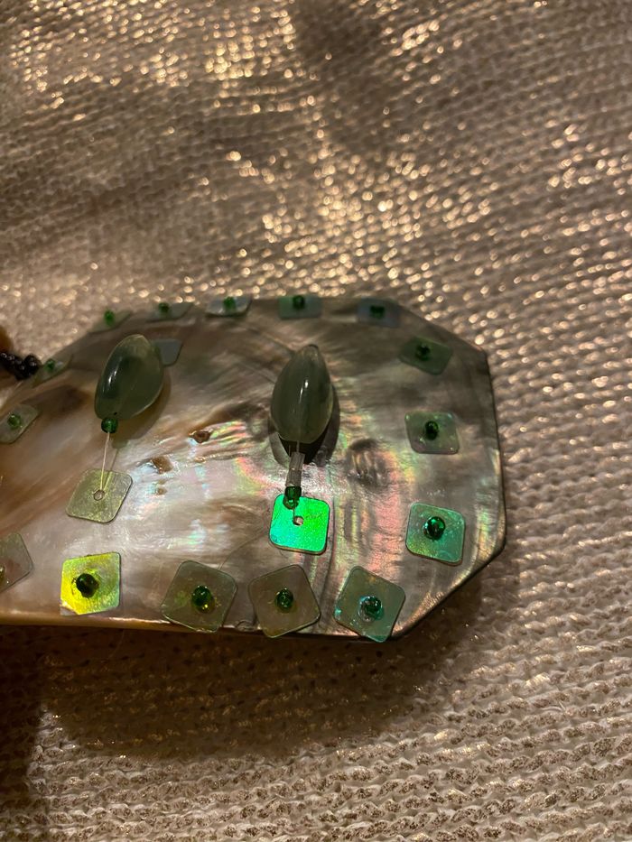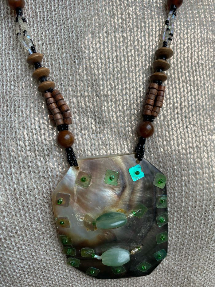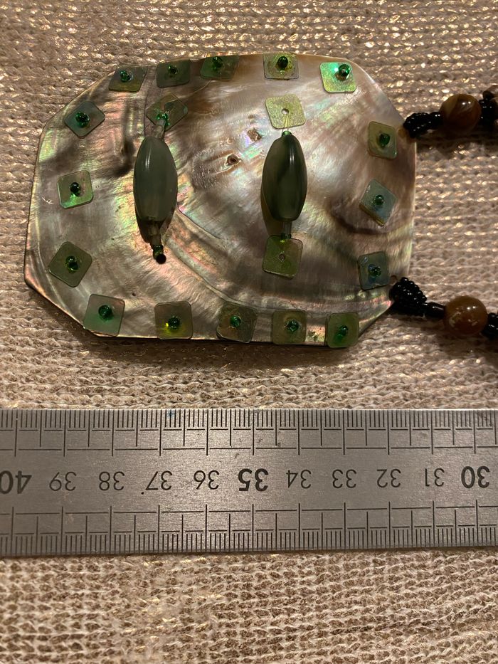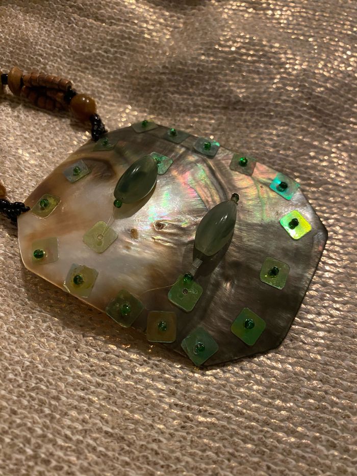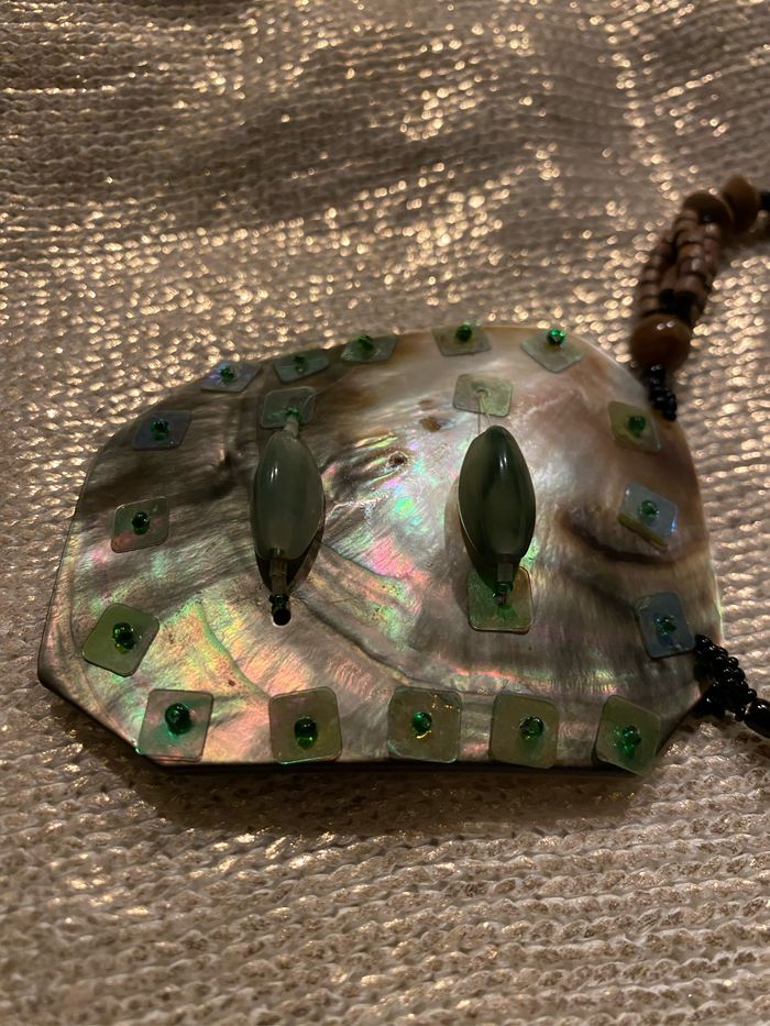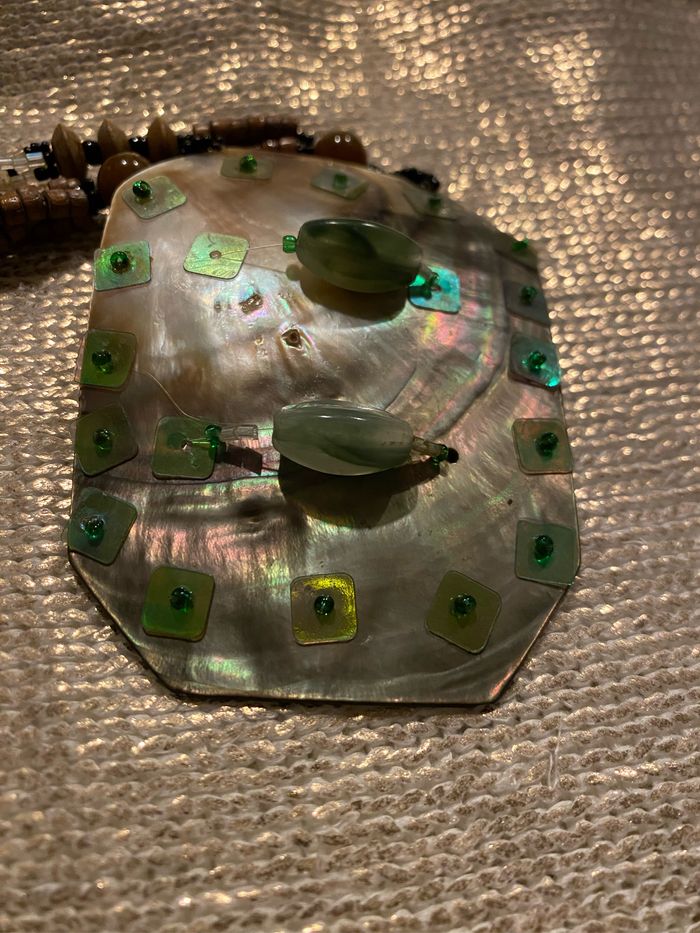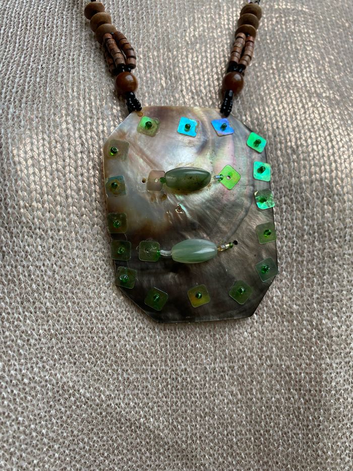 Collier vintage fines perles bois et plastique Le Médaillon en nacre 8,5 x 6,5 cm est orné de perles et sequins vert , quelques sequins fragilisés, voir photos Longueur plié 40 cm