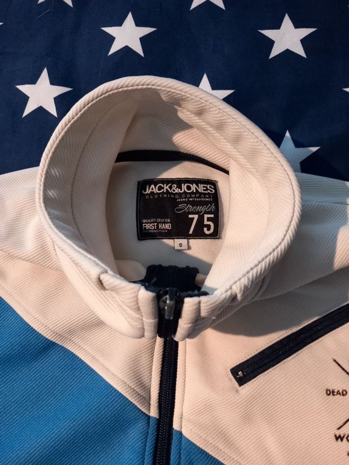 Veste Jack & Jones Taille S En très bon état Il manque juste la lichette de la tirette ce qui fait qu'elle est très capricieuse mais avec un trombone aucun souci pour ouvrir ou fermer.