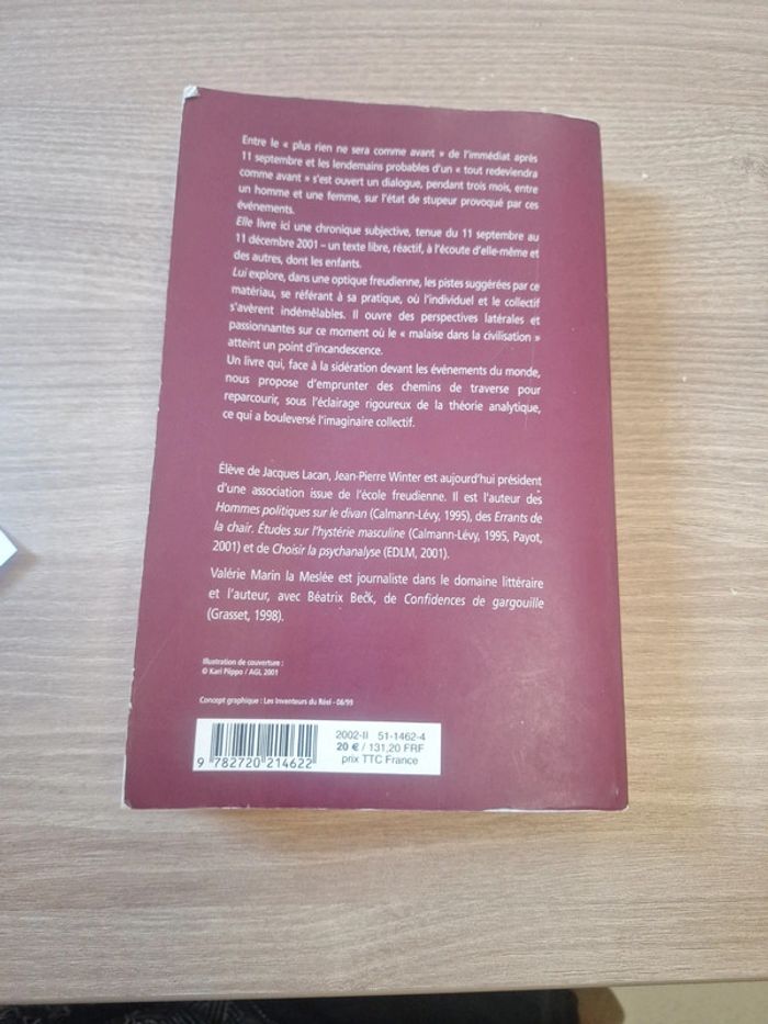 Entre le " plus rien ne sera comme avant " de l'immédiat après 11 septembre et les lendemains probables d'un " tout redeviendra comme avant " s'est ouvert un dialogue, pendant trois mois, entre un homme et une femme, sur l'état de stupeur provoqué par ces événements. Elle livre ici une chronique subjective, tenue du 11 septembre au 11 décembre 2001 - un texte libre, réactif, à l'écoute d'elle-même et des autres, dont les enfants. Lui explore, dans une optique freudienne, les pistes suggérées par le matériau, se référant à sa pratique, où l'individuel et le collectif s'avèrent indémêlables. Il ouvre des perspectives latérales et passionnantes sur ce moment où le " malaise dans la civilisation " atteint un point d'incandescence. Un livre qui, face â la sidération devant les événements du monde, nous propose d'emprunter des chemins de traverse pour reparcourir, sous l'éclairage rigoureux de la théorie analytique, ce qui a bouleversé l'imaginaire collectif.