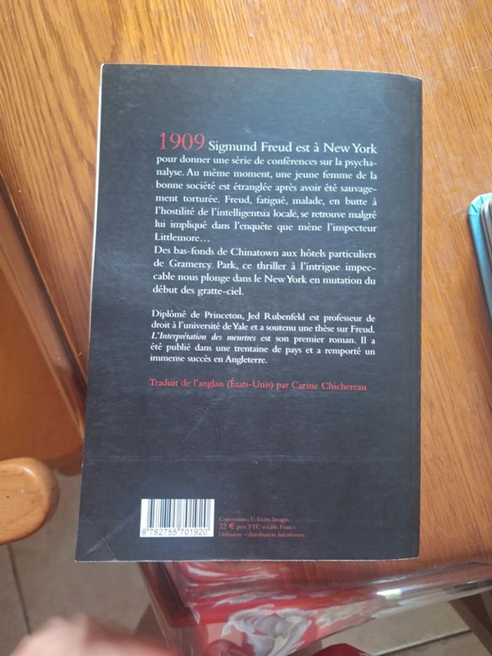 1909 Sigmund Freud est à New York pour donner une série de conférences sur la psycha- nalyse.Au même moment, une jeune femme de la bonne société est étranglée après avoir été sauvage- ment torturée. Freud, fatigué, malade, en butte à I'hostilité de l'intelligentsia locale, se retrouve malgré lui implique dans P'enquête que mène linspecteur Littlemore.. Des bas-fonds de Chinatown aux hôtels particuliers de Gramercy Park, ce thriller à Tintrigue impec- cable nous plonge dans le New York en mutation du début des gratte-ciel, Diplômé de Princeton, Jed Rubenfeld est professeur de droit. T'universitê de Yale eta soutenu une thèse sur Freud. L'Interpretation des meurtres est son premier roman. = été publié dans a une trentaine de pays et a remporté immense succès en Angleterre. 9782755701920