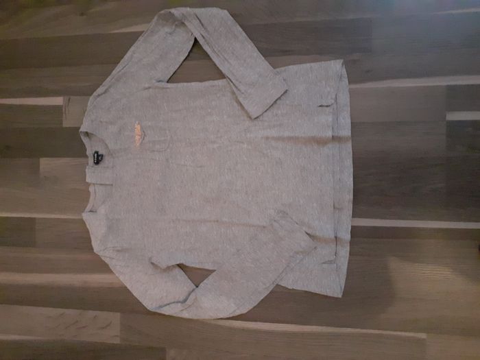 Joli t-shirt manches longues, gris, petite poche à l'avant avec quelques paillettes couleur bronze. Taille : 10 ans Marque : Kiabi Très bon état