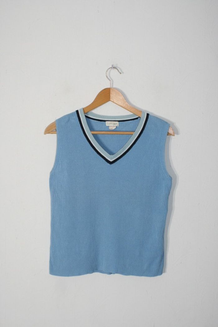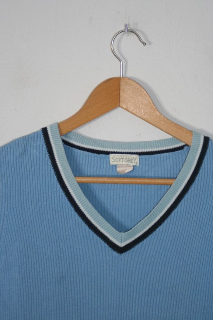 Pull sans manche col V marque Soft Grey taille 42/44, bien porté, 37.5cm d'épaule à épaule, 44.5cm d'aisselle à aisselle, 55.5cm de long, 190g