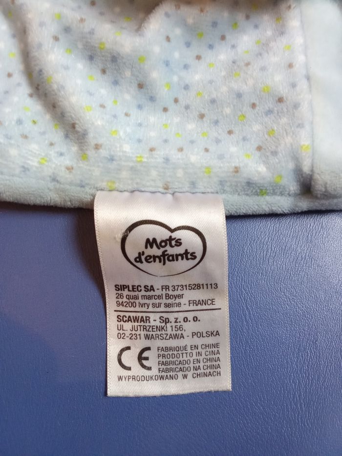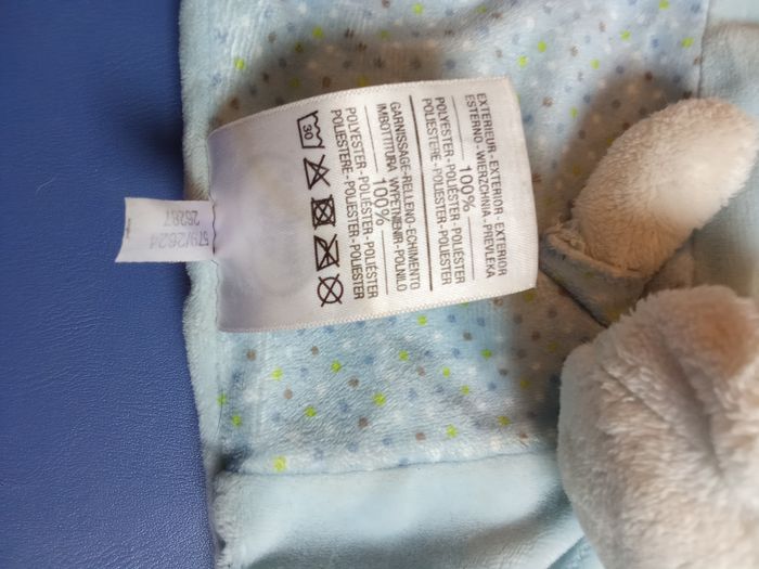 Doudou carré marque mots d'enfants bleu avec motif.1 grande étiquette et une plus petite, bon état général. Beaucoup d'autres doudous mm marque également à vendre ds mon dressing et réduction activée