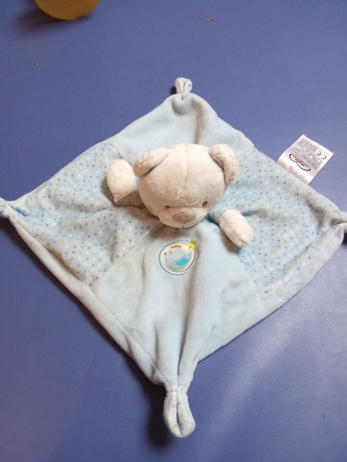 Doudou carré garçon bébé tête ours bleu mots d'enfants, motif, mouchoir leclerc - photo numéro 1