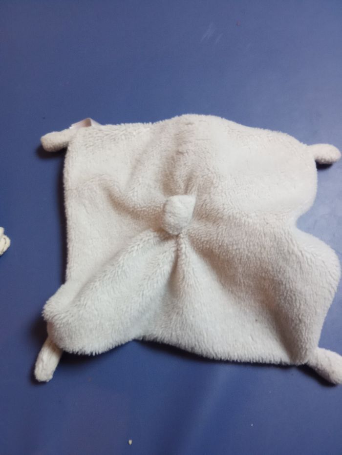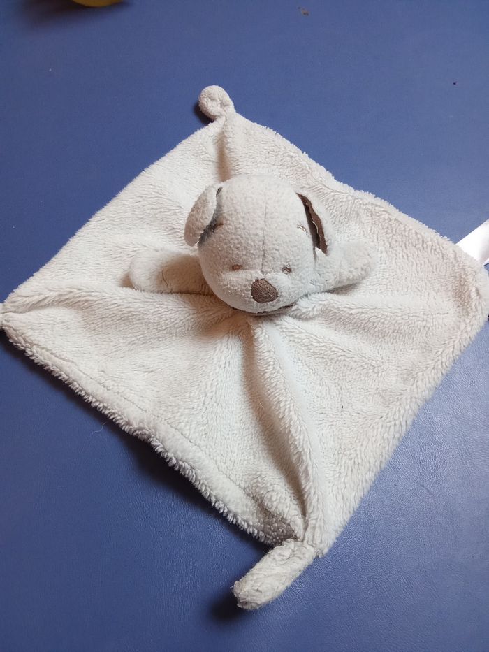 Doudou mouchoir tête chien couleur blanc, oreilles marron. 3 étiquettes présentes, marque presque disparu sur l'étiquette. Bon etat général. Beaucoup d'autres doudous également à vendre ds mon dressing et réduction activée