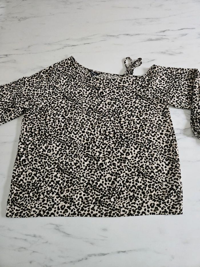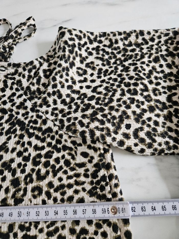 Blouse Imprimée léopard avec une épaule nue. Matière un peu crépon. Elle est en état impeccable et les dimensions se trouvent sur les photos