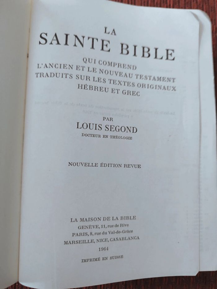 Cet ouvrage comprend l'Ancien et le nouveau testament traduit sur les textes originaux Hébreux et grec par Louis segond docteur en théologie imprimé en Suisse 1964