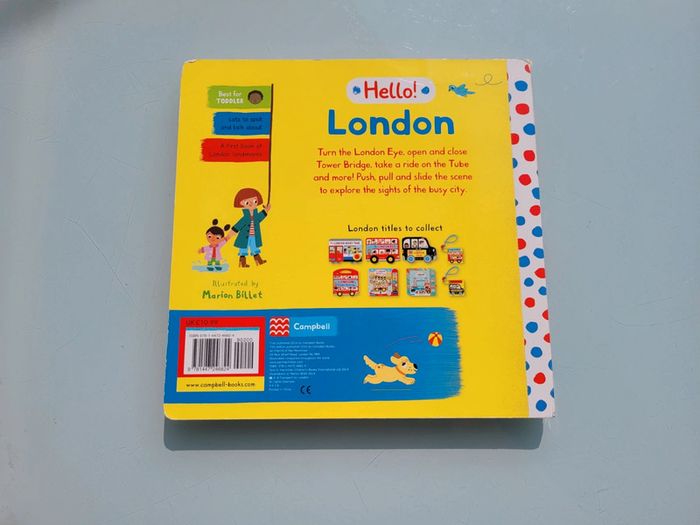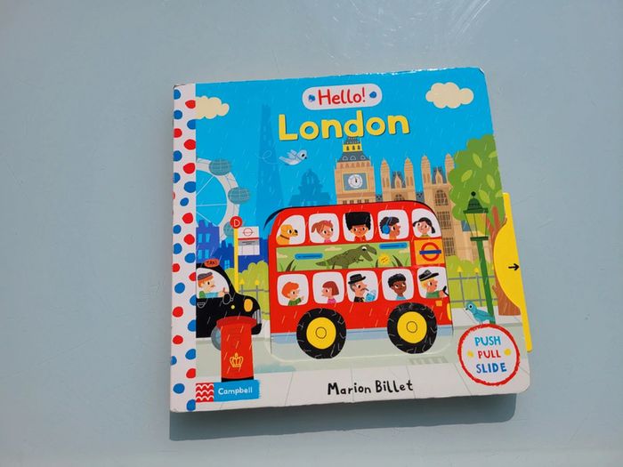 HELLO! LONDON LIVRE EN ANGALIS Poussez, tirez et faites glisser les scènes de Londres pour explorer les sites touristiques de la ville animée. Tournez le London Eye, ouvrez et fermez le Tower Bridge, et même hissez le drapeau au palais de Buckingham ! Faisant partie de la gamme populaire Campbell London, Hello ! London est un grand livre cartonné lumineux doté de mécanismes faciles à utiliser, conçu pour les tout-petits. Les illustrations colorées de la célèbre illustratrice française Marion Billet regorgent de détails et d'éléments à repérer, ce qui en fait une introduction parfaite à Londres et un excellent moyen de partager les souvenirs d'une première visite. Grand format : 25.4 x 1.78 x 25.4 cm Tout carton très bon état ⚠️ entièrement en anglais Mes autres livres enfants : #livreenfantmooglou