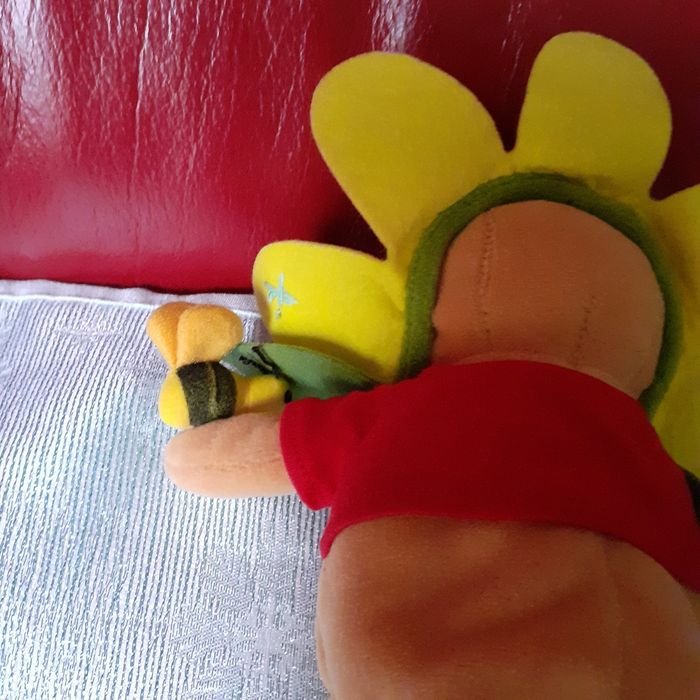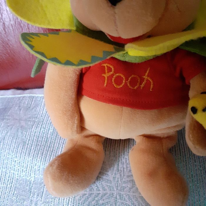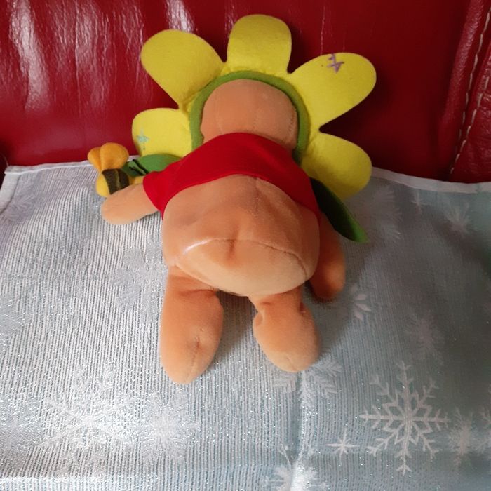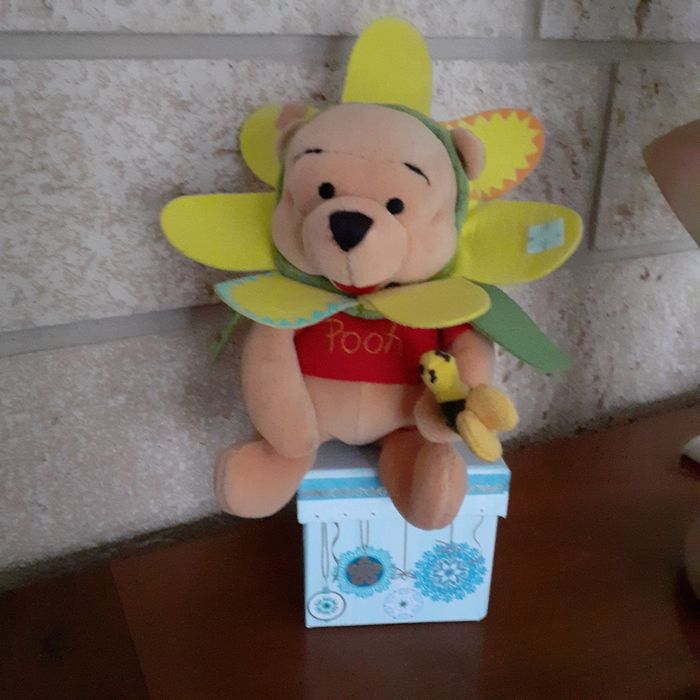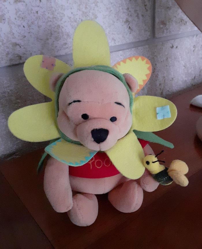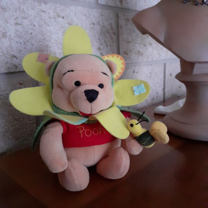 Doudou-peluche Winnie l'ourson entièrement rembourré. Avec petite abeille 🐝 cousue sur 1 patte et chapeau-fleur non amovible. Yeux et museau brodés; petites billes dans le bas du corps pour faciliter le maintien en position assise. Pétales de la fleur en feutrine, ainsi que les déco-rapiècements. Hauteur totale de 18 cm // voir photos pour détails. À Noter : ne tient pas debout ; étiquette coupée derrière.