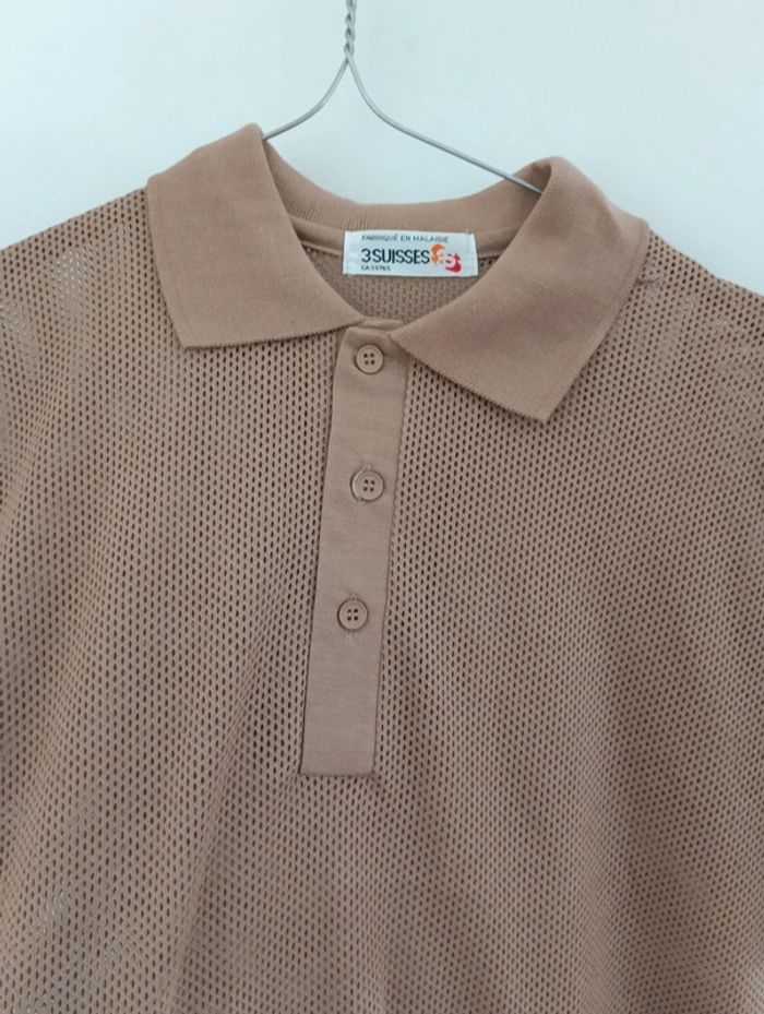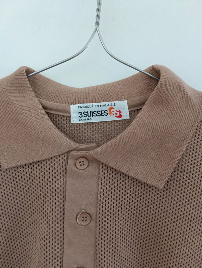Polo ajouré marron clair vintage taille S 88/92 Neuf Distribué par les 3 suisses 65% polyester 35% coton Mesures Epaules 42cm Aisselles 46cm Longueur 71cm