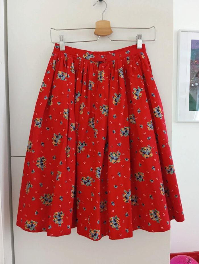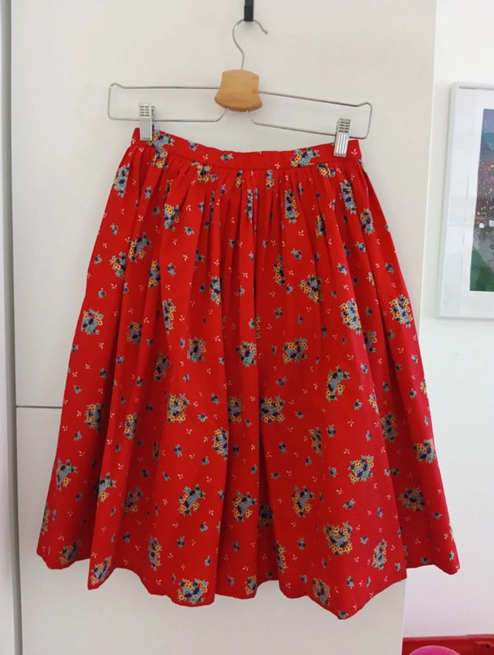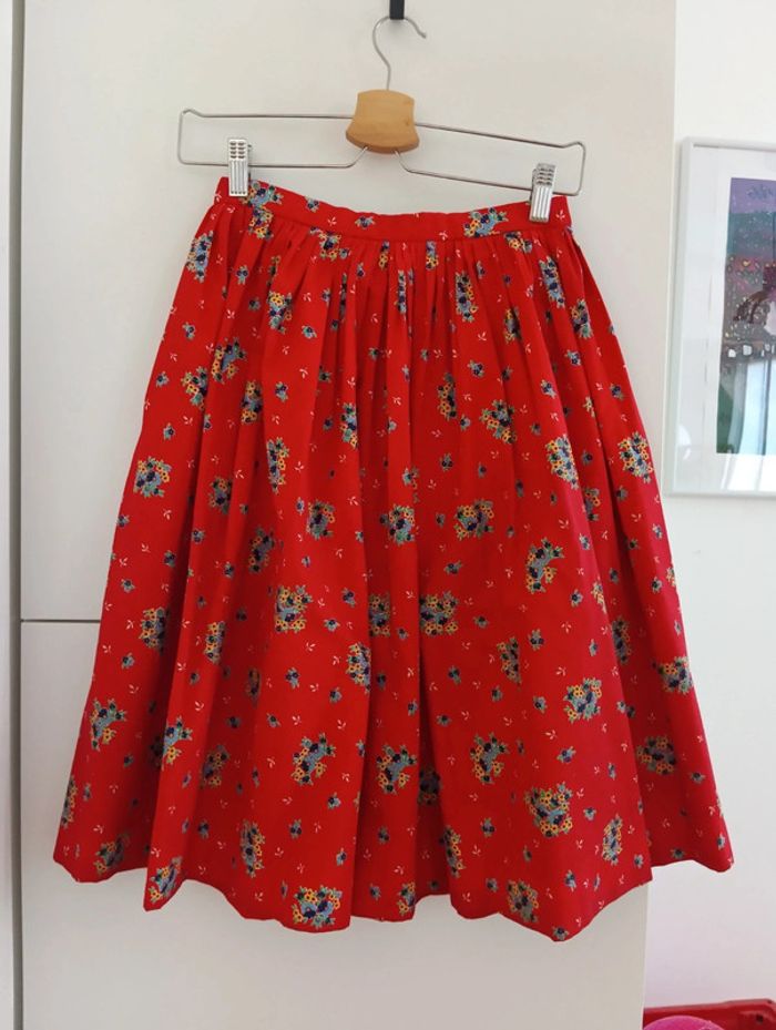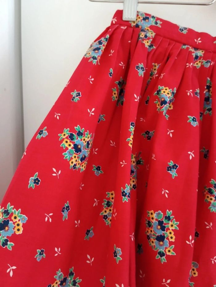 Jupe en coton vintage handmade sous le genou Rouge à fleurs Jolie amplitude taille 34 estimée À confirmer avec les mesures Taille 32 cm Longueur 62 cm bord de la ceinture légèrement blanchi.
