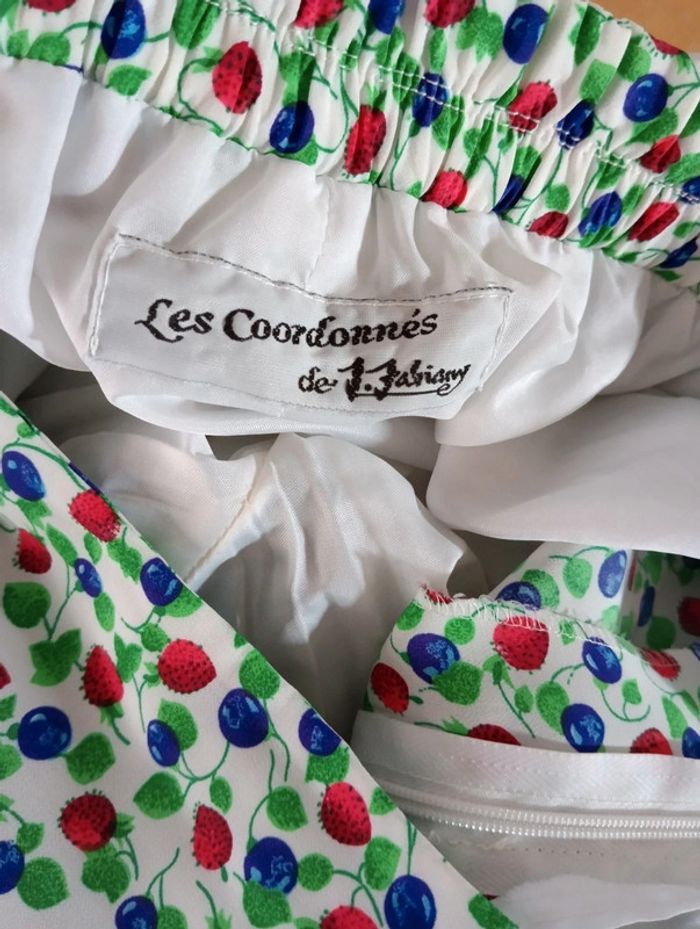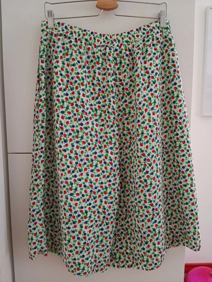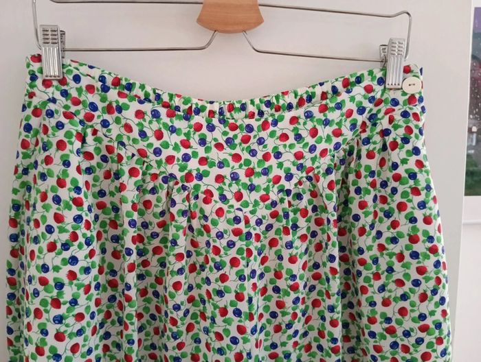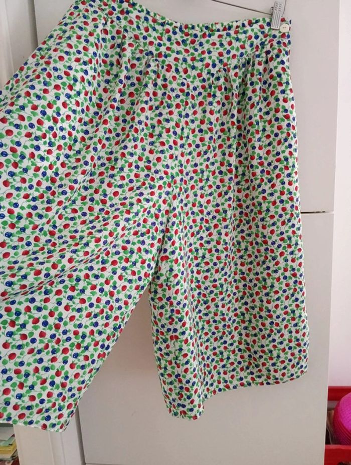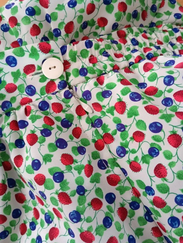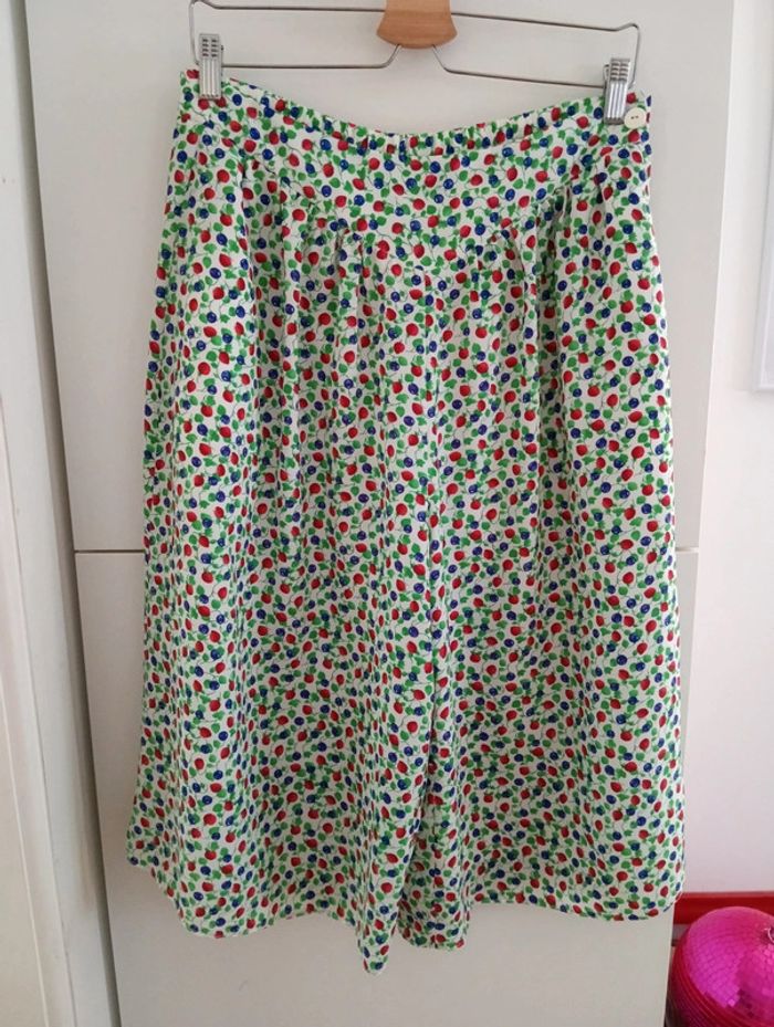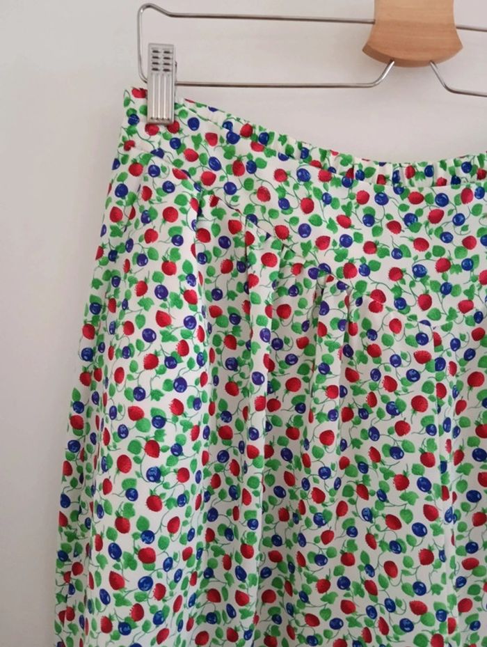 Jupe culotte vintage taille 42 estimée Fond blanc imprimé fruits Fermeture + bouton sur le côté Mesures Taille 40cm ( légèrement élastique au dos) Longueur 70cm