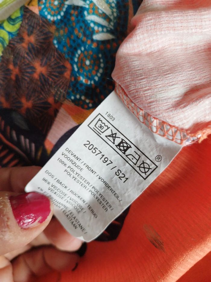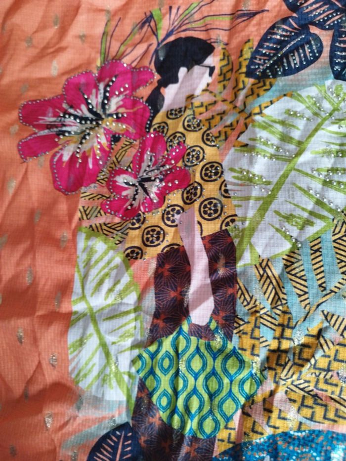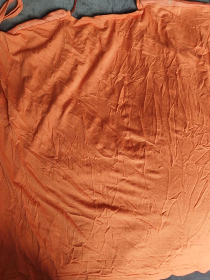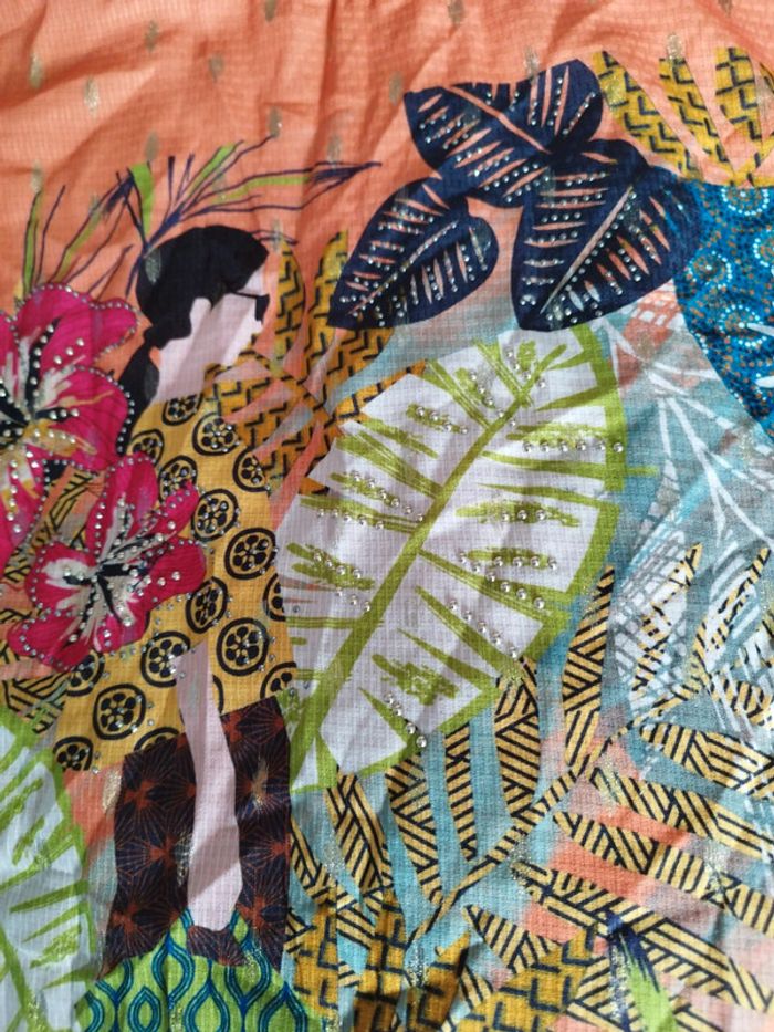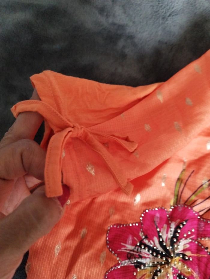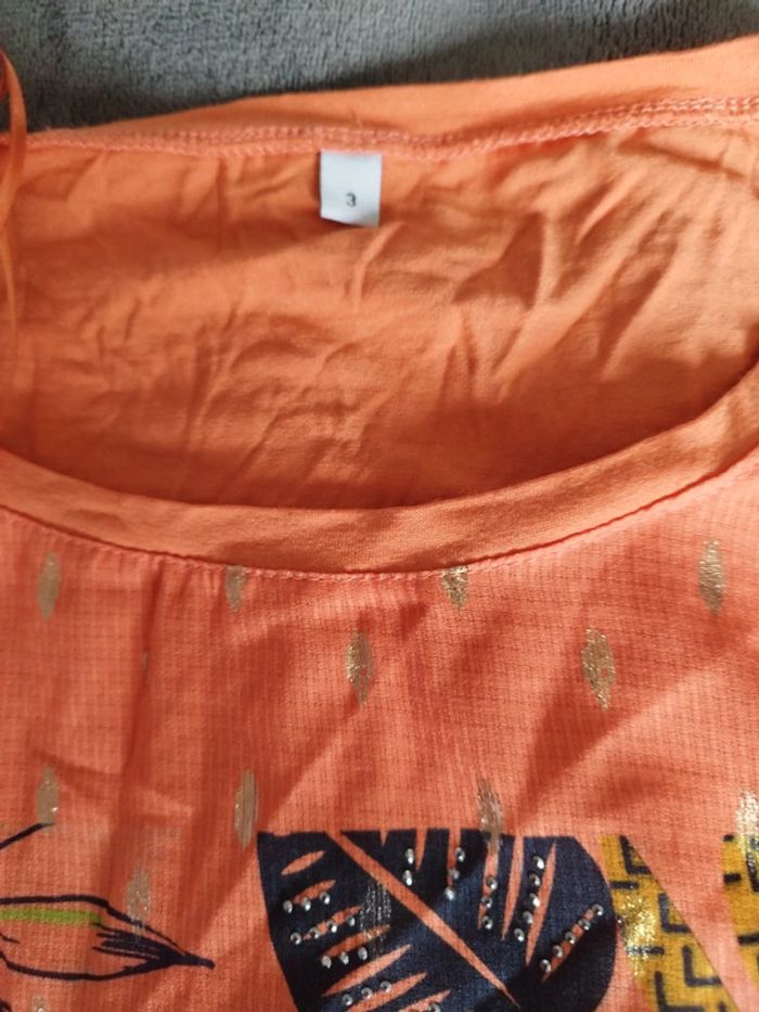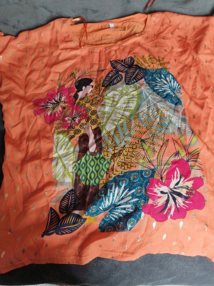 Superbe tee-shirt shirt femme taille 3. Jusqu'au 46/48. Couleur orange pétillante. Idéal pour l'été. Manches courtes avec petit nœud aux épaules. Superbe dessin devant coloré nature. Incrustation doré.