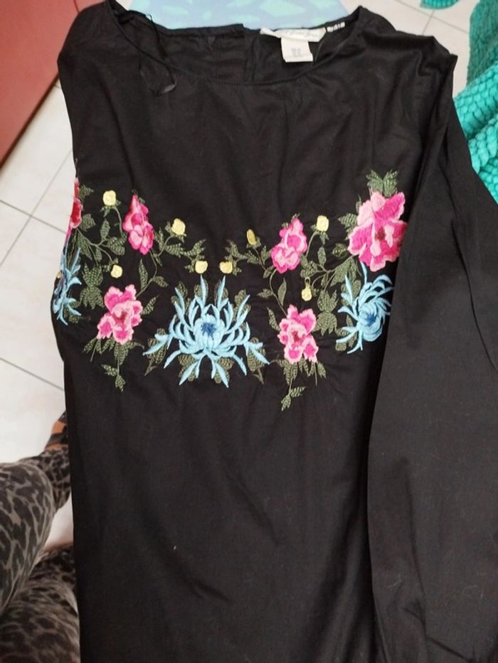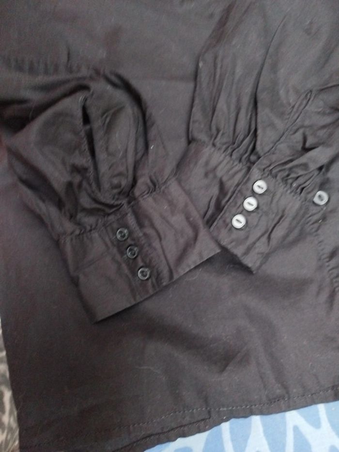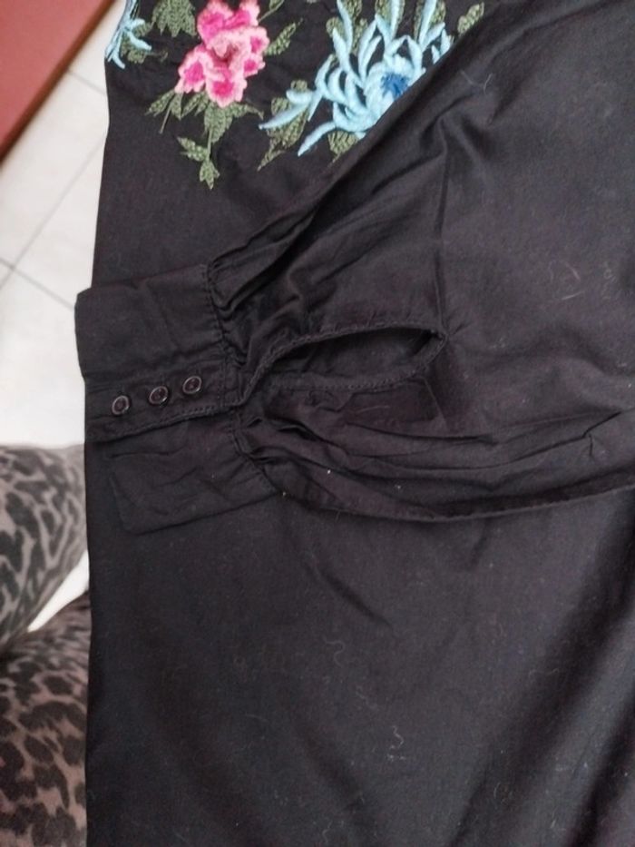 Très belle chemise manches longues avec broderie devant magnifique. Se ferme par l'arrière. Les boutons sont au dos. Peut se porter à l'intérieur d'un pantalon ou en liquette. Impeccable. Marque h et m.