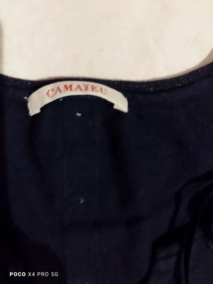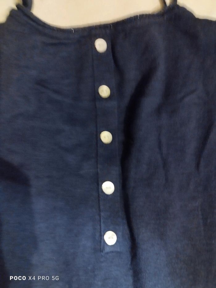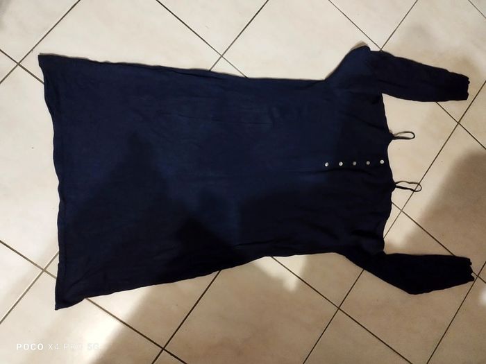 Belle robe marine camaïeu 42/44. Cette robe est en léger lainage très agréable à porter. Pas besoin de repasser. Attention petit défaut voir photo tâche de décoloration d'où prix sacrifiés. Longueur totale : 95 cm, largeur sous aisselles : 58 cm , longueur manche : 68 cm , largeur épaules : 46 cm.