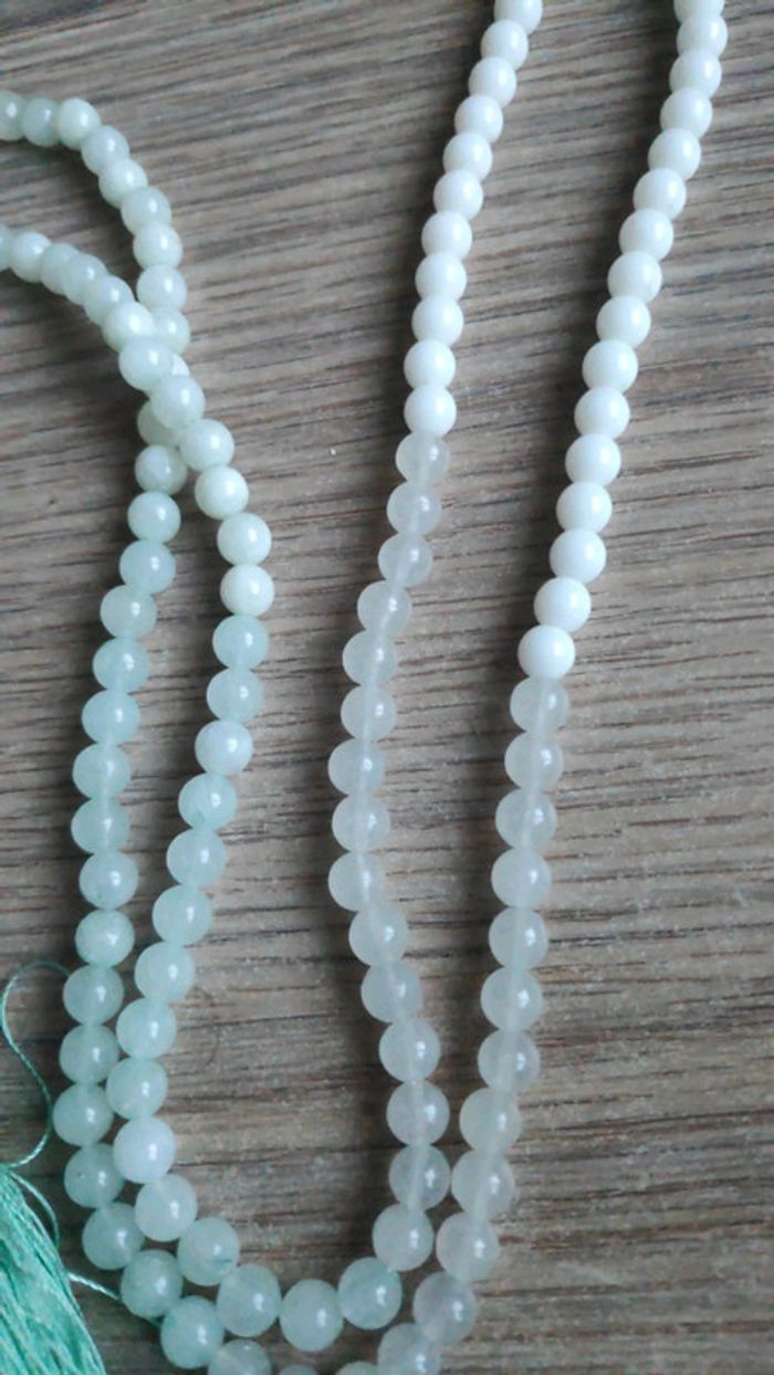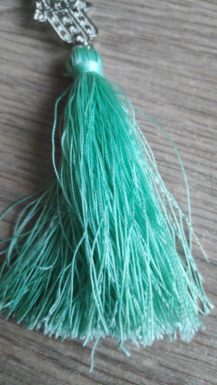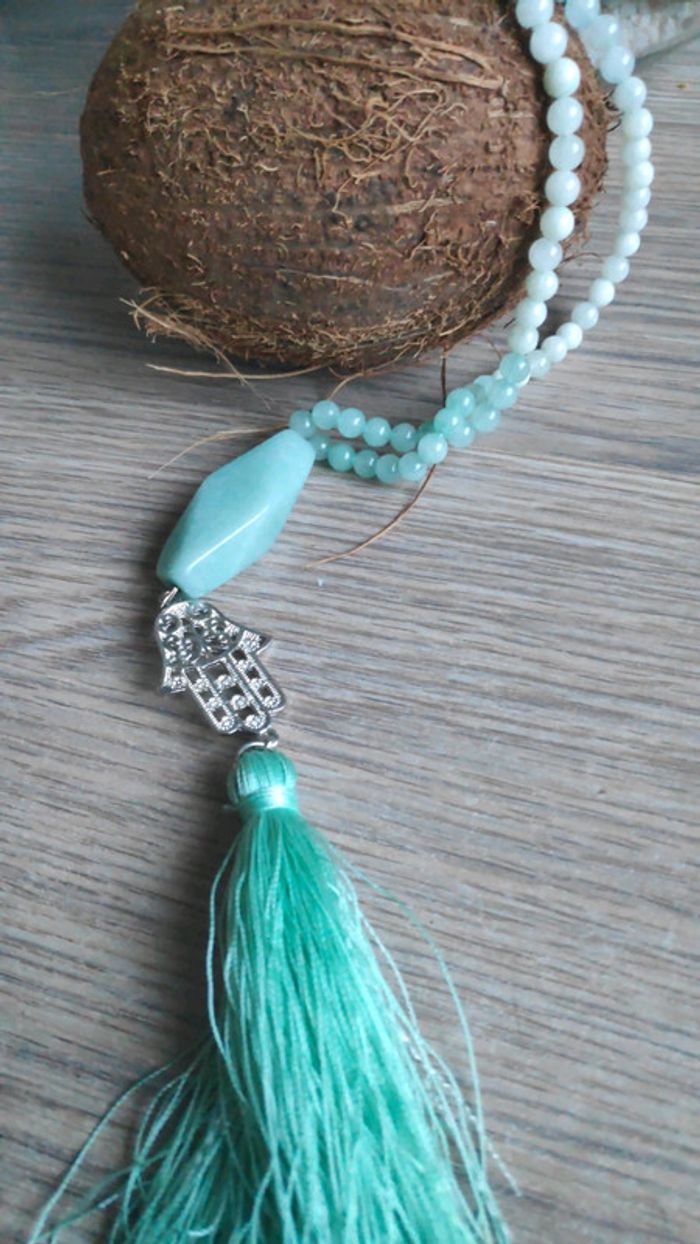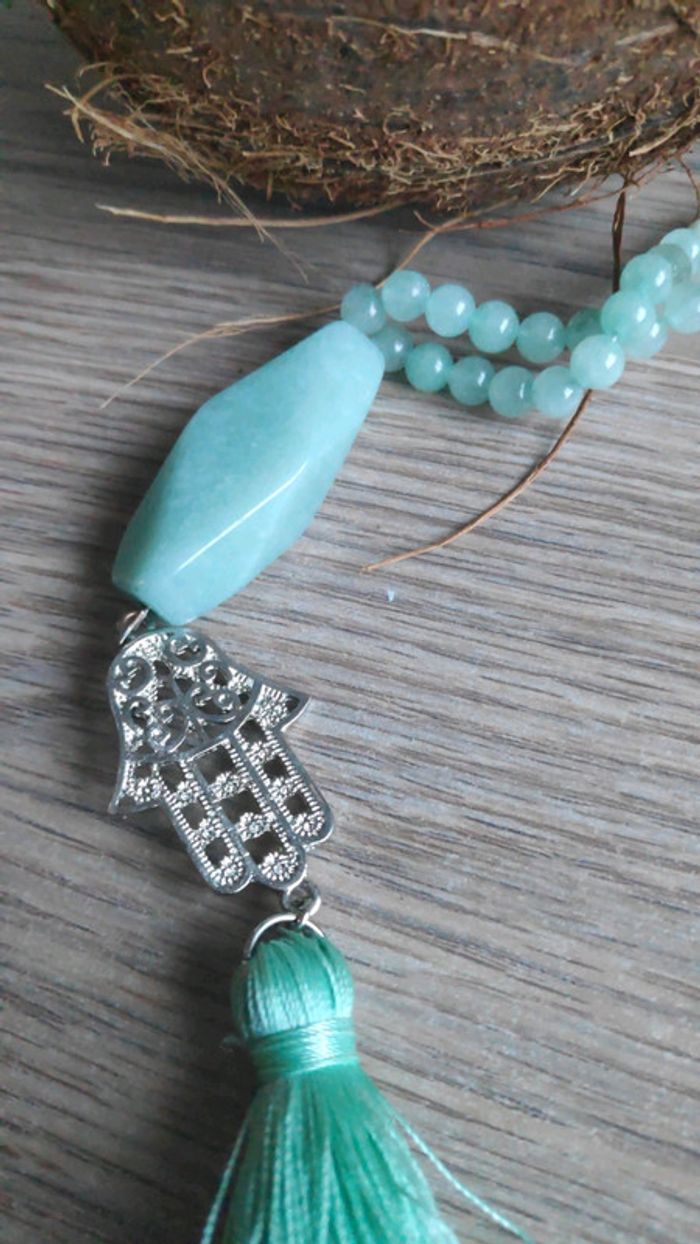 Superbe collier long main de Fatma : chance. En pierres de verre Vert, blanc et Vert multiples. Longueur jusqu'à la taille au portée.