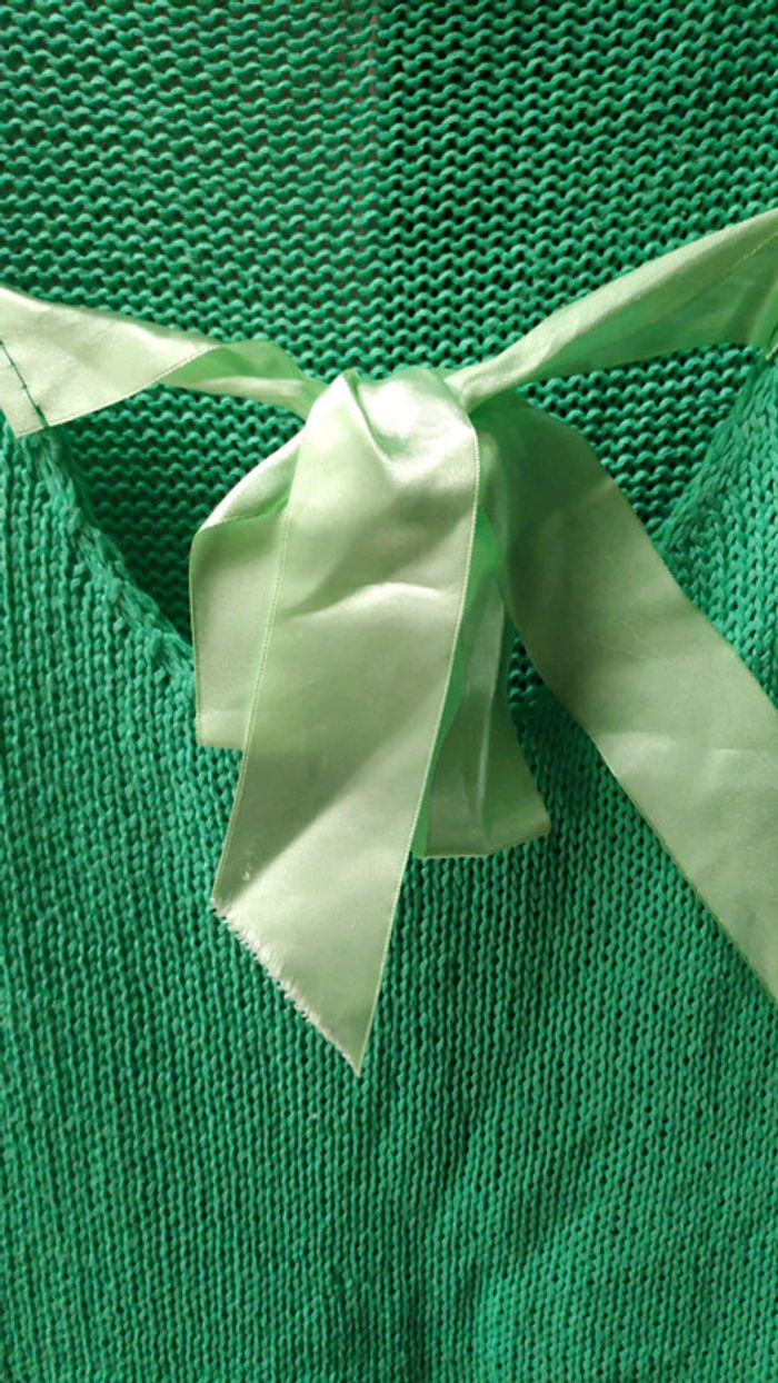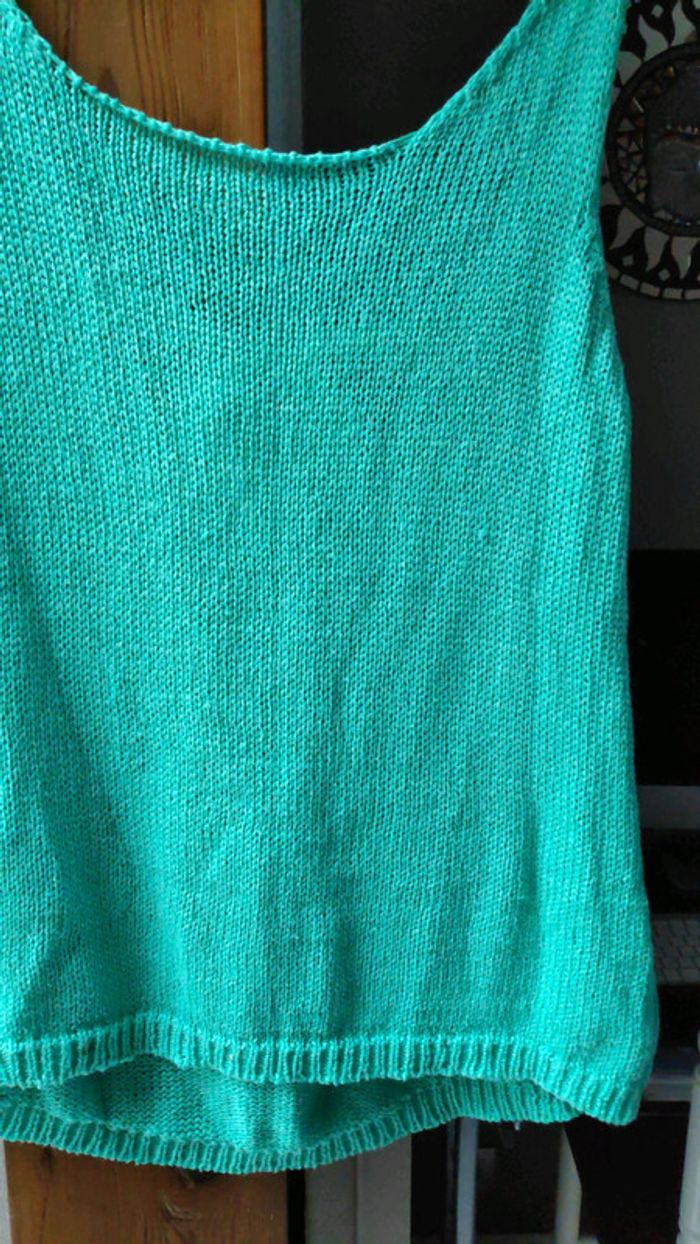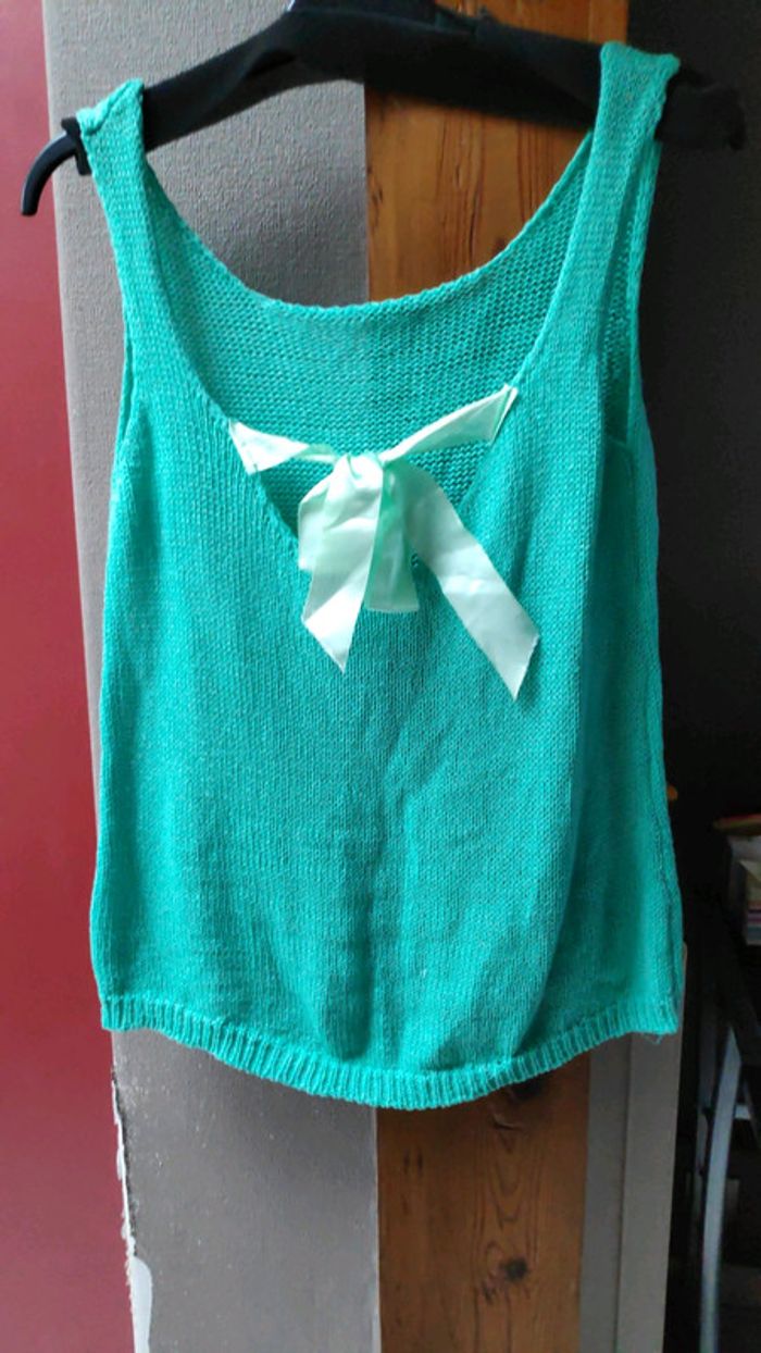 Très beau débardeur vert d'eau avec noeud dans le dos en satin très belle qualité. Jamais porté. La couleur représentative est celle sur la photo 2 et 3 . Taille 38 jusqu'à 44 . Tout dépend si on veut un effet près du corps ou pas