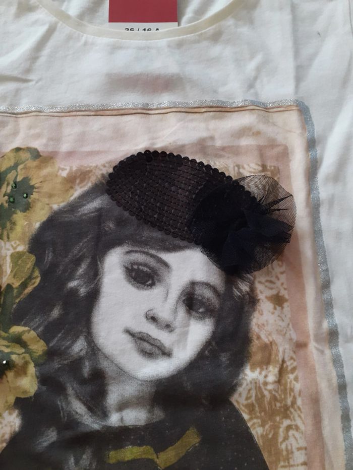 Maillot manches longues, fond écru avec imprimé « Fille au chapeau », chapeau en relief de marque Sismix taille 16 ans NEUF
