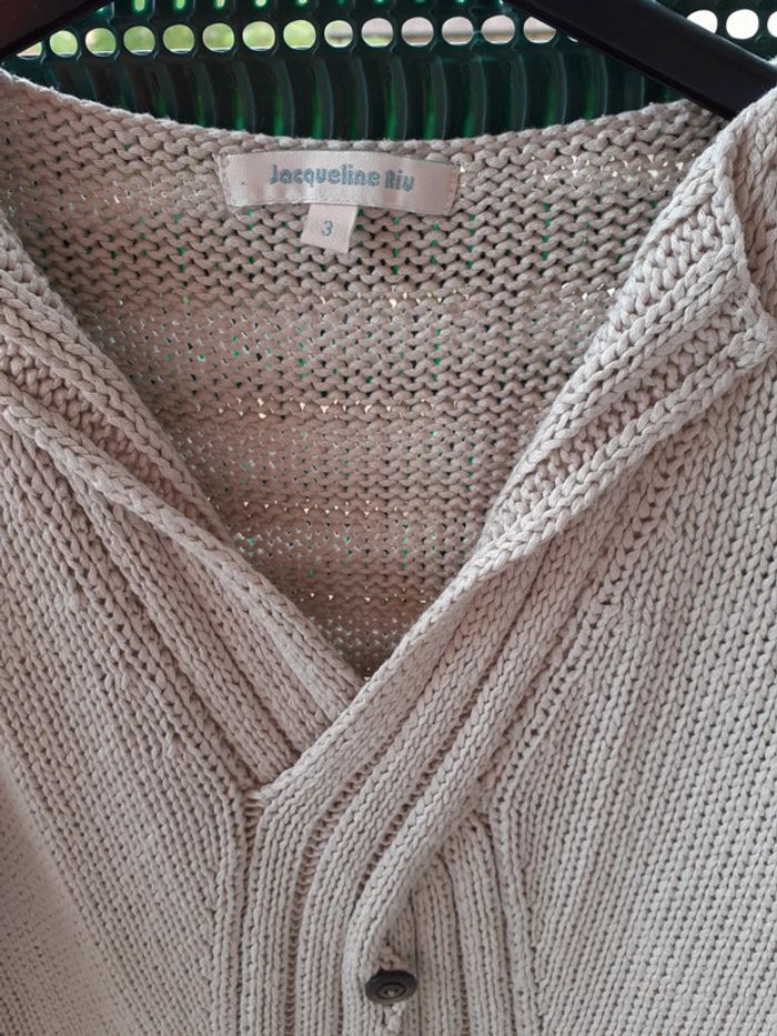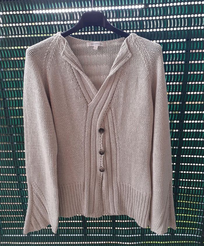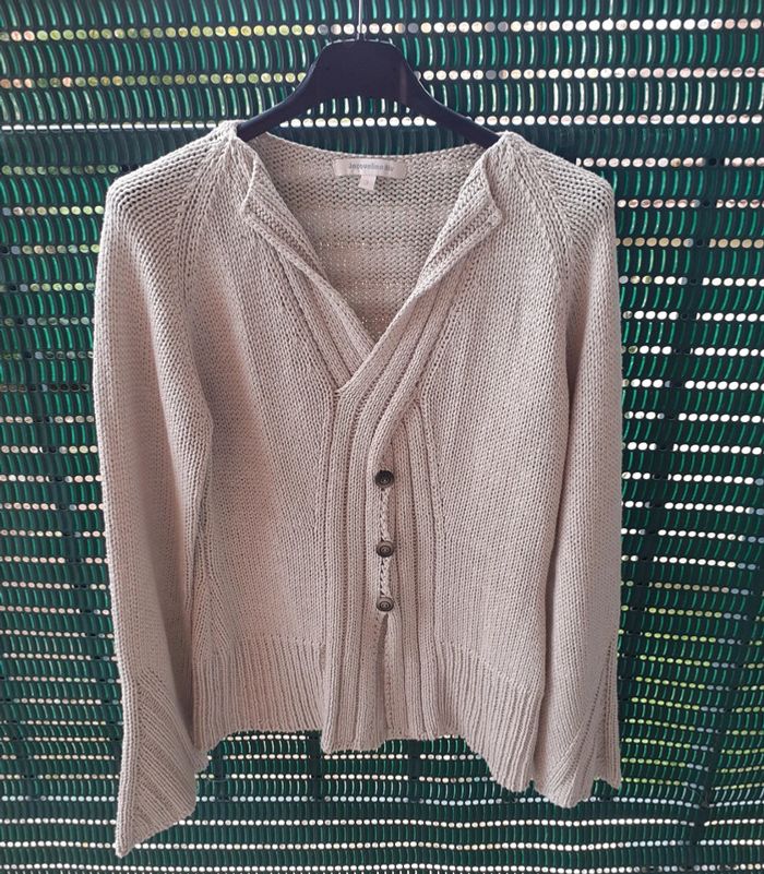 Gilet beige, À enfiler, col en "V" Manches longues, poignets amples Torsadé sur le devant avec boutons en bois en "déco" De marque Jacqueline Riu Taille 3 (taille petit) Excellent état