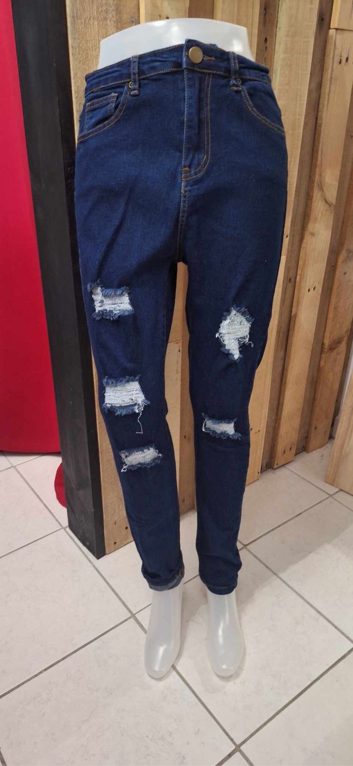 FEMME 38 / M N°2456 Jeans bleu foncé Troué Longueur 99 cm 65% coton 33% polyester 2% elasthane Taille 38 / m Boohoo Neuf plus d étiquette 🏷 6,50€ #kelly_femmeT38