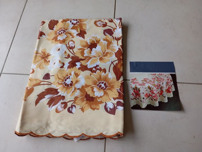 Nappe sur les tons marrons beiges avec fleurs neuve Avec 7 serviettes Dimensions 200x140 cm environ Neuve ms l'emballage c cassé 50 %coton et 50 % polyester