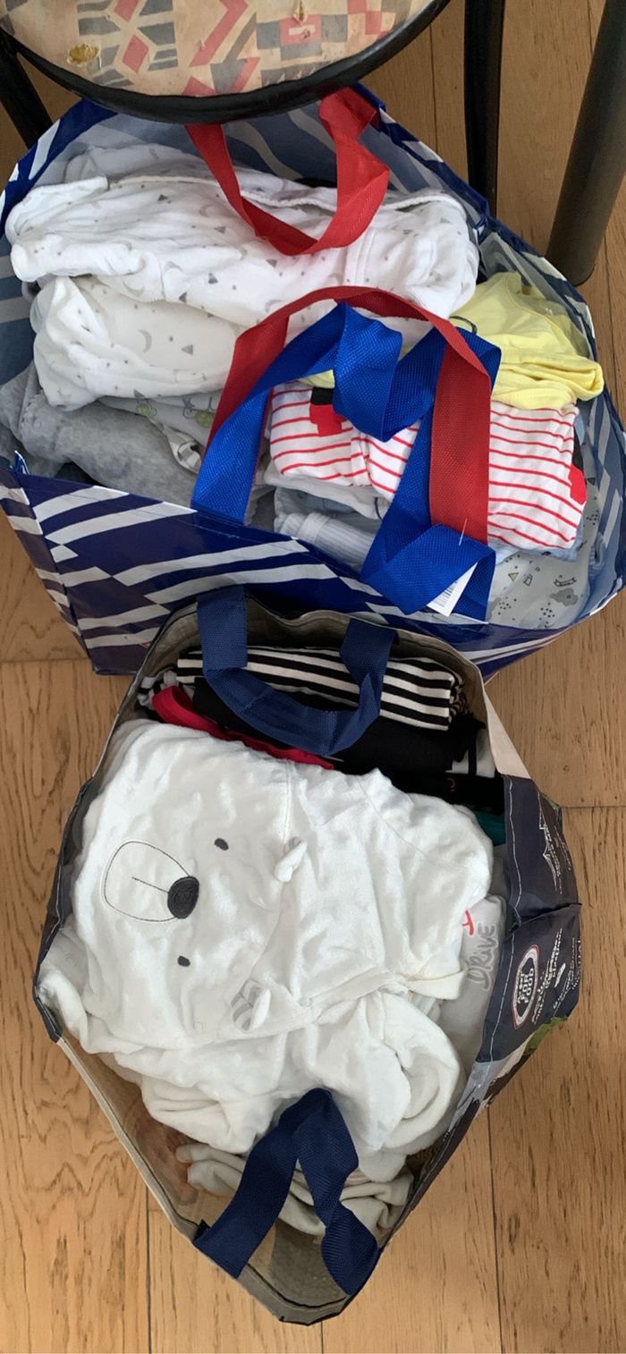 Lot de vêtement pour bébé garçon de 0 à 12 mois. Le lot contient des bodys, des grenouillères, des pantalons, des t-shirt et pulls