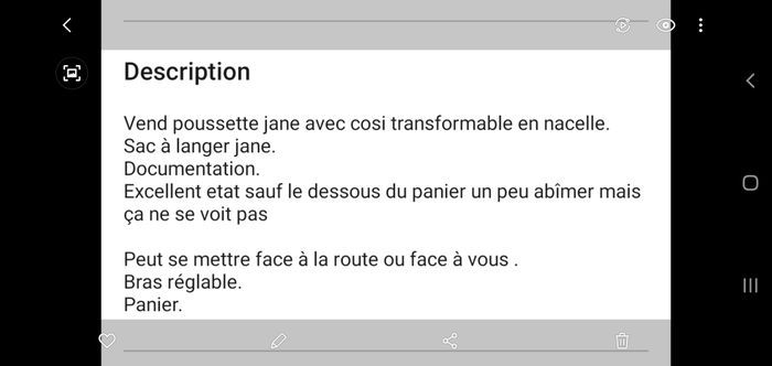 Vend poussette jane avec nacelle transformable en cosi. Sac à langer. Panier. Bras réglable. Peut se mettre dos et face à la route. Très bon etat mis a part le dessous du panier un peu abîmé mais ca ne se voit pas.