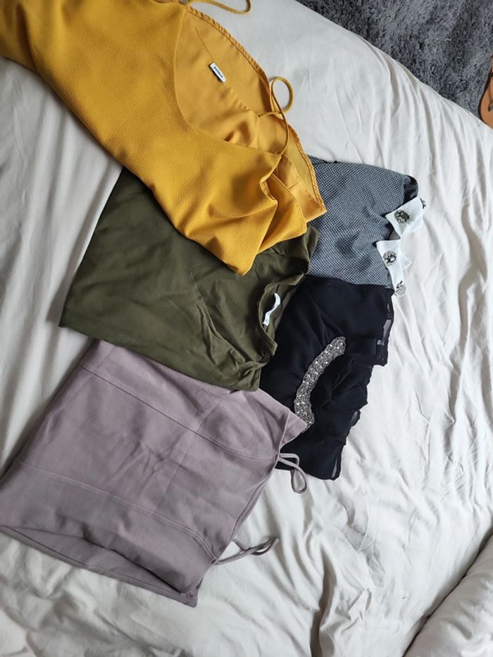 Lot de 5 vêtements été 2 chemisiers manches courtes et débardeurs 1 tee shirt 2 robes Marques : pimkie, forever 21, pull and bear, mim Le tout en parfait état
