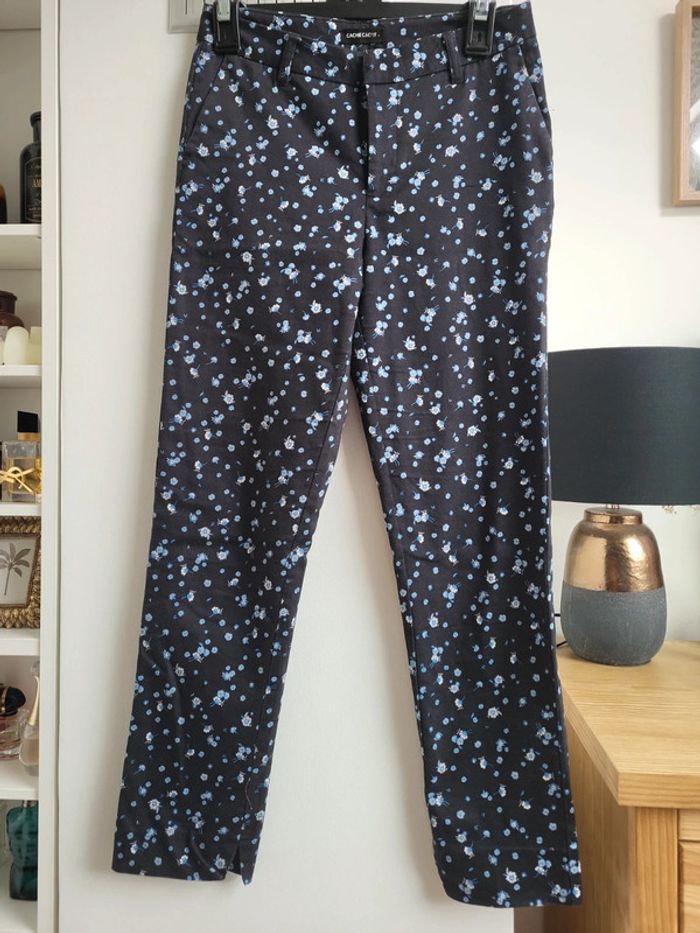 Pantalon chino noir avec petites fleurs bleues et blanches, très sympa avec une blouse broderie anglaise par exemple 🌸 Idéal pour l'été