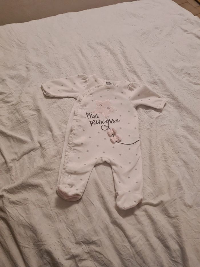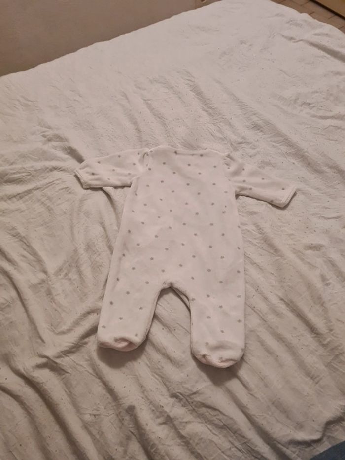 Taille 0 En parfait état blanc avec des petites étoiles gris claire ,des étoiles rose claire écritures et des petits noeu