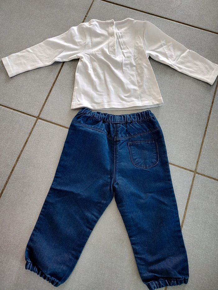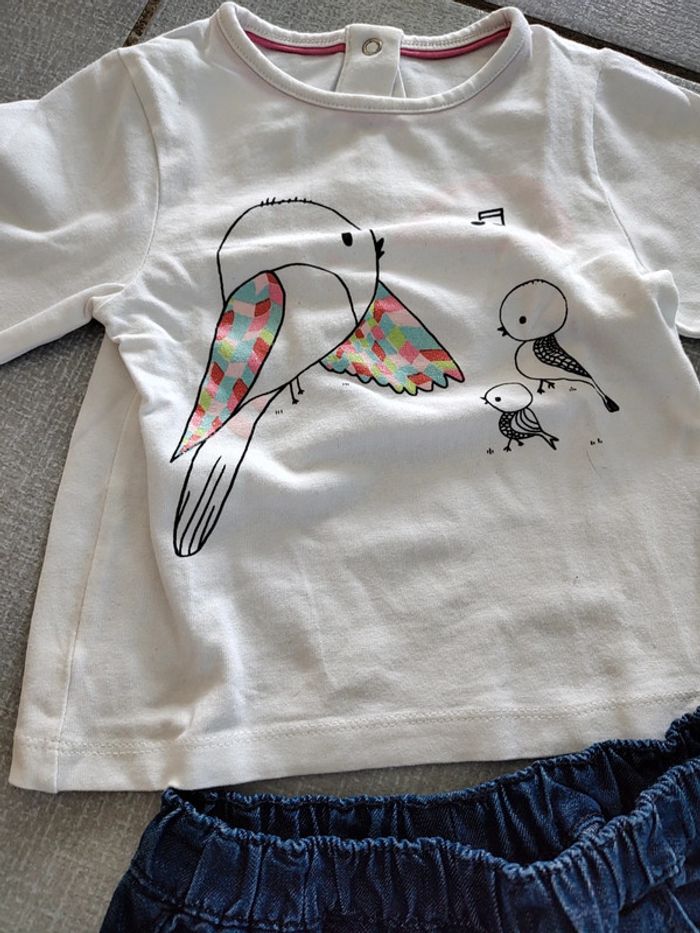 Ensemble Orchestra composé de • 1 t-shirt avec boutons pression à l'arrière. Motif oiseaux musique. • 1 pantalon en jean avec poches à l'avant et une poche à l'arrière. Taille élastiquée et resserrée en bas des jambes. 69% coton 31% polyester Taille 18 mois (81 cm) Foyer non fumeur