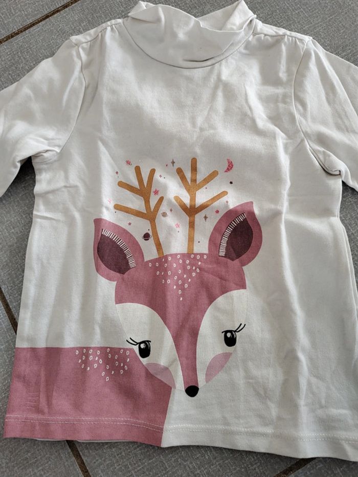 T-shirt manches longues avec motif renne de Noël rose avec bois dorés à paillettes Col haut. Boutons pression à l'arrière Taille 23 mois (86 cm) Foyer non fumeur