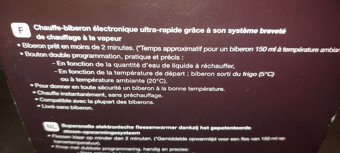 En bon état. Rapide et très pratique pour chauffer biberons et petits pots en quelques secondes. Livré dans son emballage d'origine.