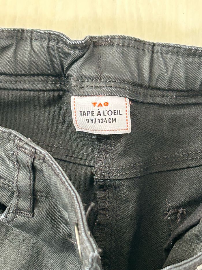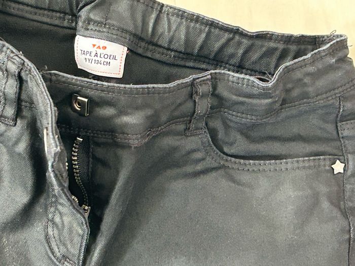 Jeans 5 poches noir, effet enduit. Élastiques de serrage pour la taille. Taille 9 ans de chez « Tape à l’œil ». En excellent état.