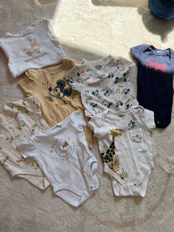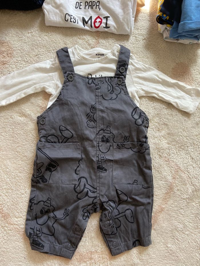 Lot été 3 mois 5 euros le lot, à l’unité 2 euros la Combi bleu 1 euro le tee shirt un euro la grise 1 euro le tee shirt et o,50 ctm pièce body. Le body est un don il a une tache au col.
