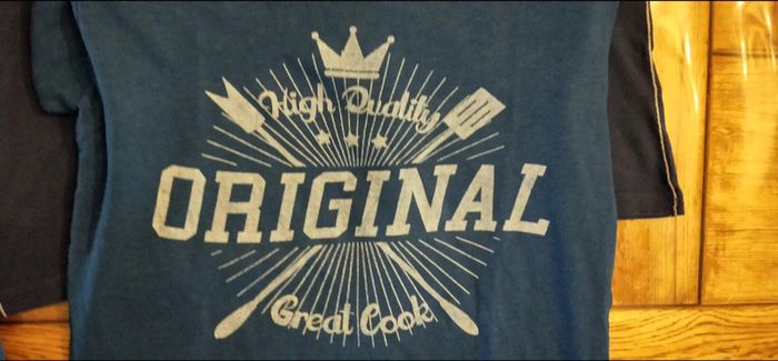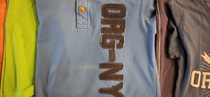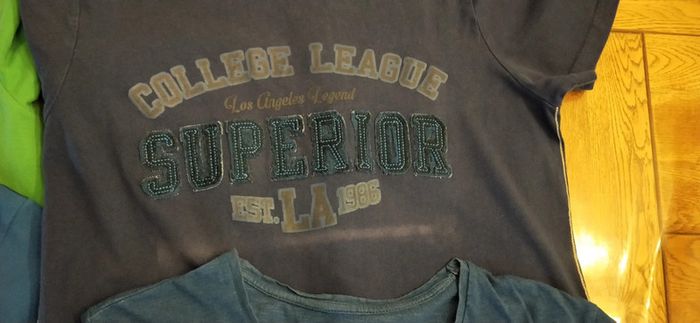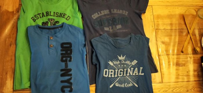 Lot de 5 tee-shirts Le vert n'a jamais été porté Le bleu à boutons environ 2 fois et les 2 autres bleus plusieurs fois Certains sont un peu plus épais que d'autres A noter qu'ils présentent une légère décoloration au niveau du pliage