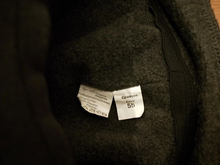 Casquette déperlante sur dessus et visière polaire Intérieur polaire Cache oreilles à utiliser tel quel ou possibilité de les rentrer à l'intérieur Taille 55 cm ,réglable par élastique et coulisse derrière Lavée, jamais portée Couleur noir et gris