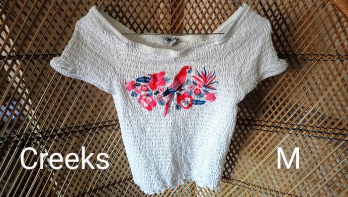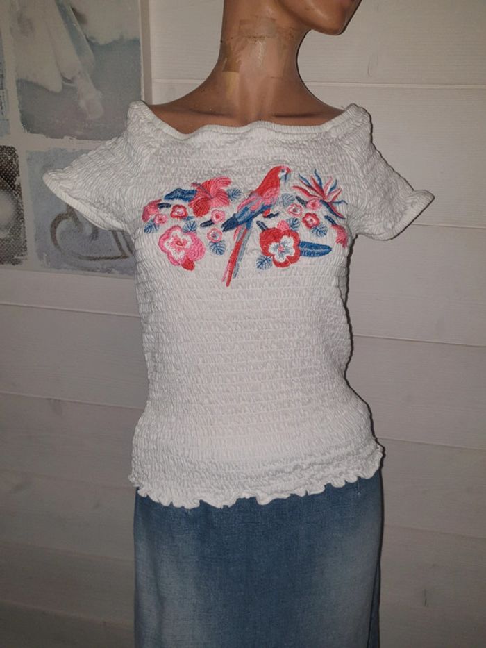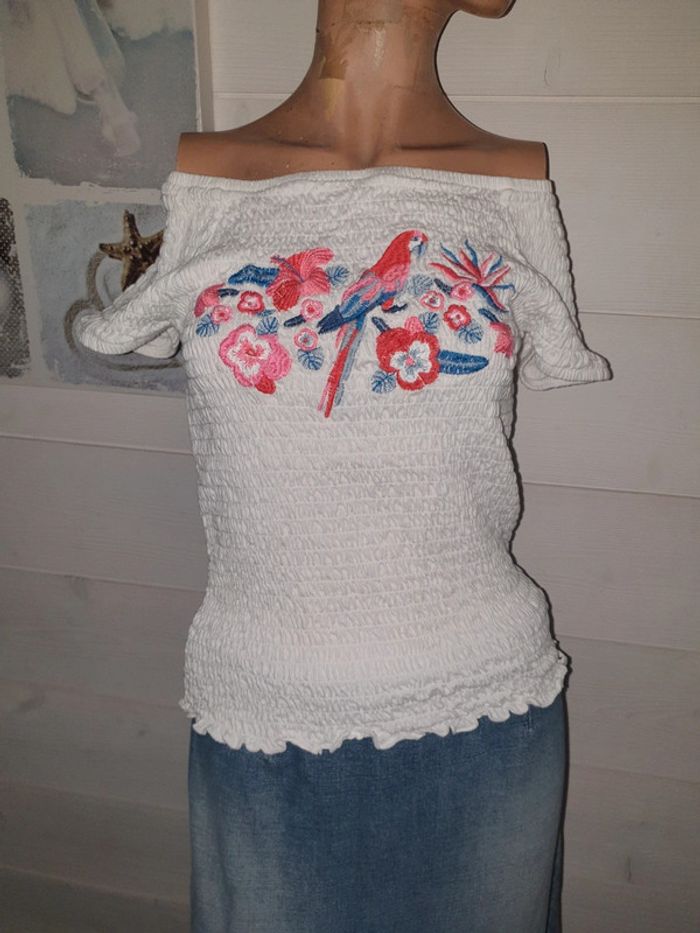 Jamais porté. Magnifique broderie fleurie sur le devant. Matière hyper élastique peut correspondre à un 36/38/40. Col bardot vintage pour denuder les épaules ou pas.. 😉 N'hésitez pas à me contacter pour plus d'informations et à fouiller dans mon dressing pour acheter en lot et profiter des réductions.. #louloulipop36 #louloulipop38 #louloulipop40 #louloulipophauts #louloulipopprintempsété