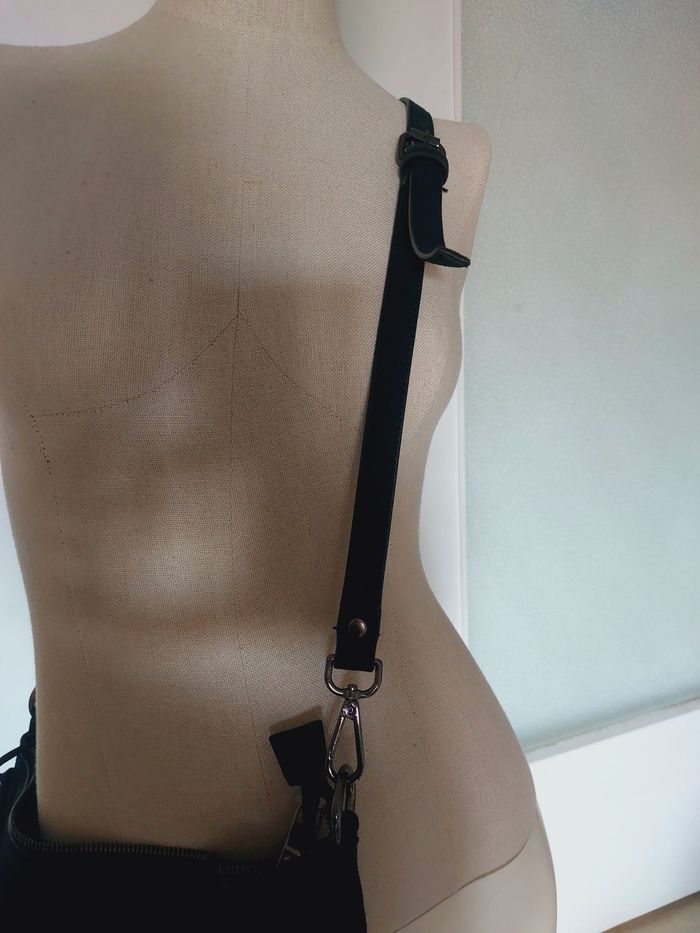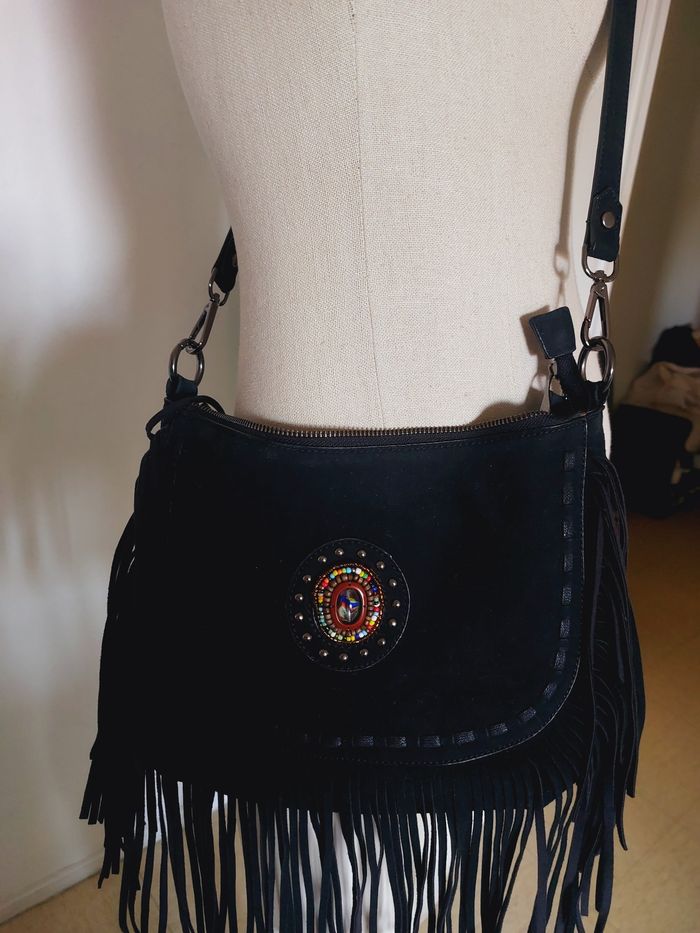 Sac en cuir effet velour. A franges. Bretelle réglable. 30 cm long x 23 cm de haut.