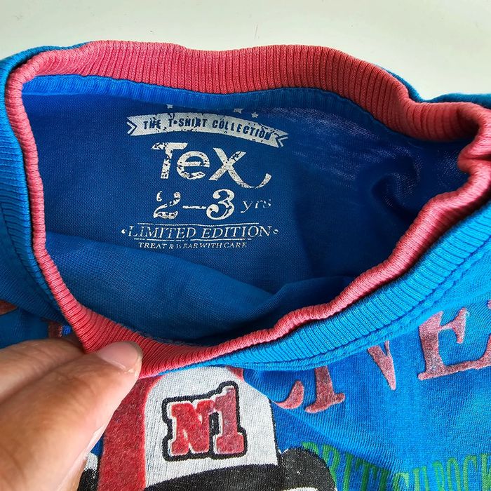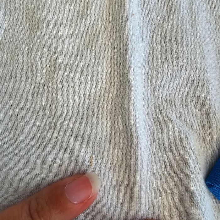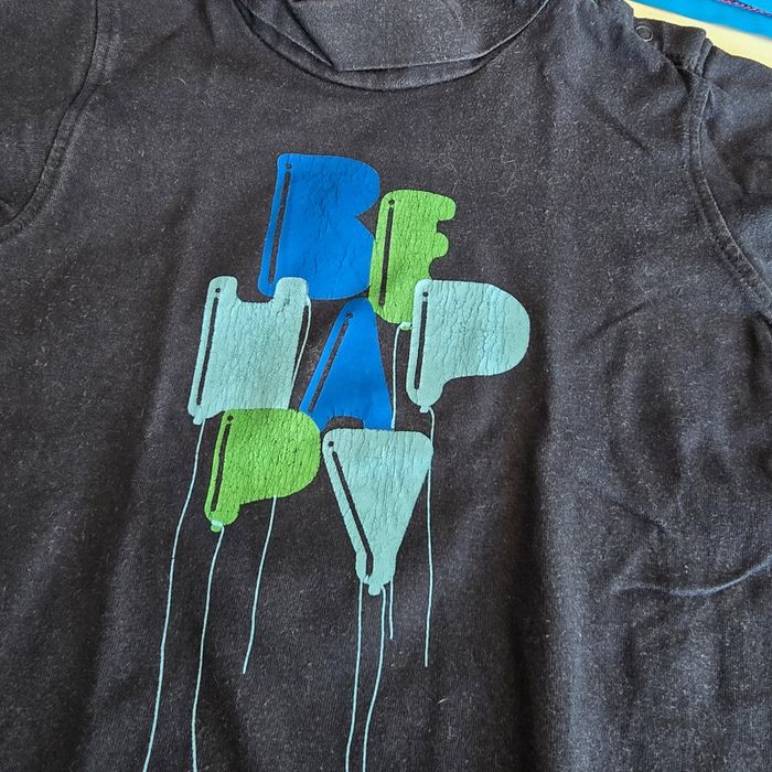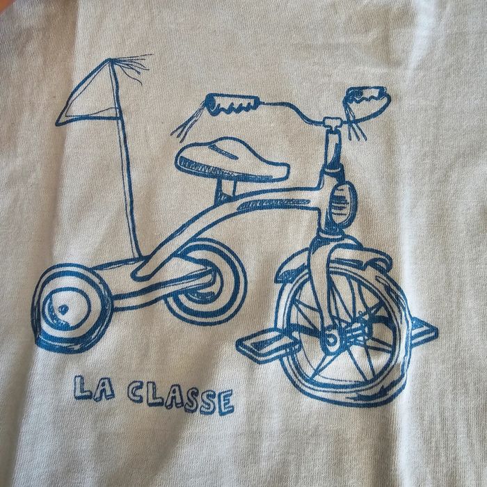 En bon état général Craquelures sur motifs du t-shirt marine Petite tâche sur le crème Écriture rouge moins vive sur le bleu