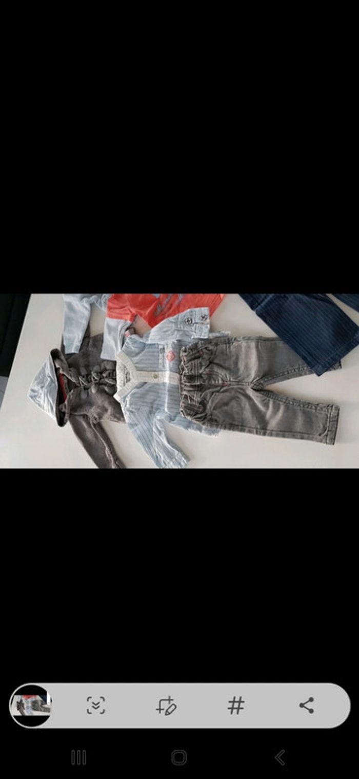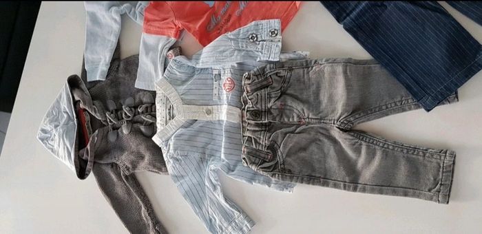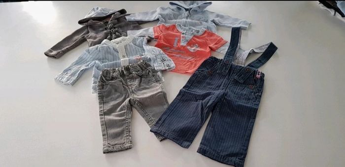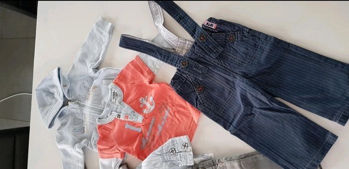 Très bon état car très peu porté Le lot comprend 1 jean 1 pantalon avec bretelles amovibles 1 T-shirt manches longues 1 chemise manches longues 2 gilets à capuche