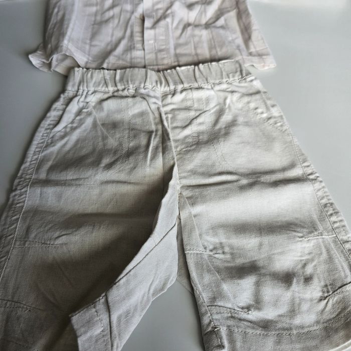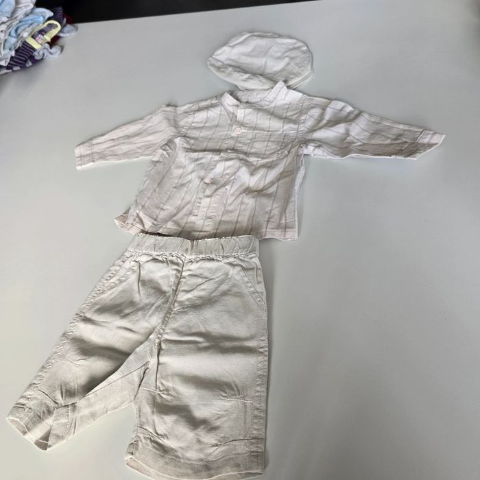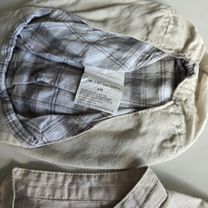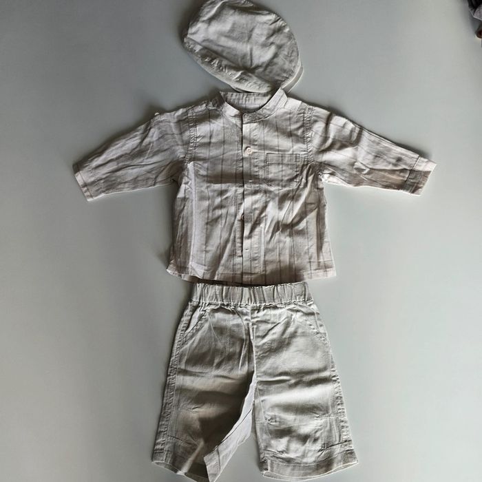 En très bon état car très peu porté Ensemble comprenant 1 short en lin Une chemise manches longues en lin Un béret en lin