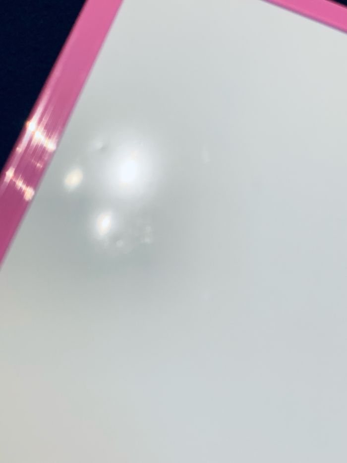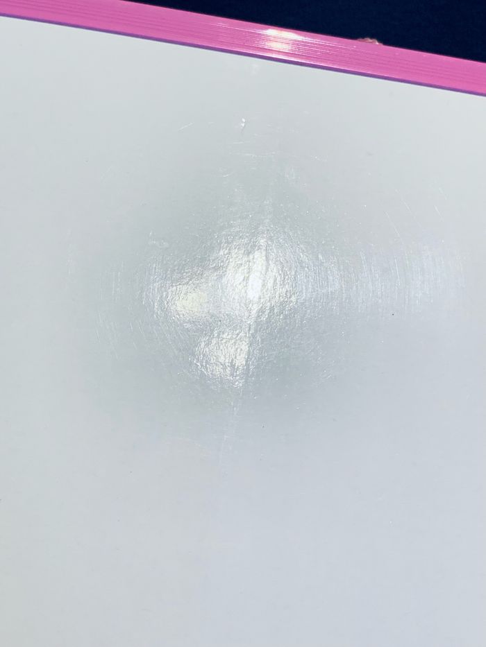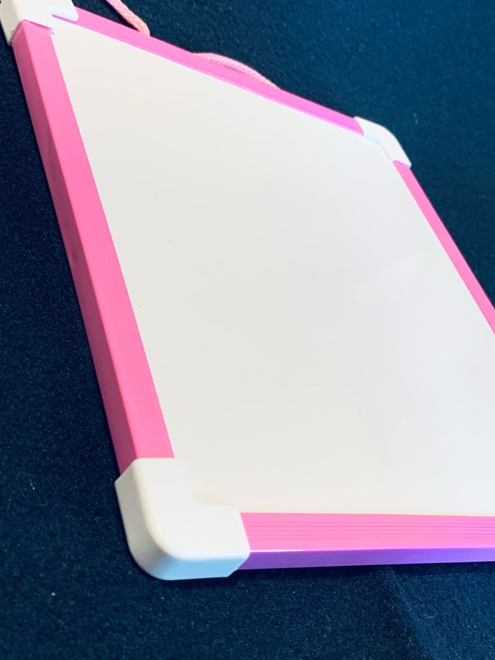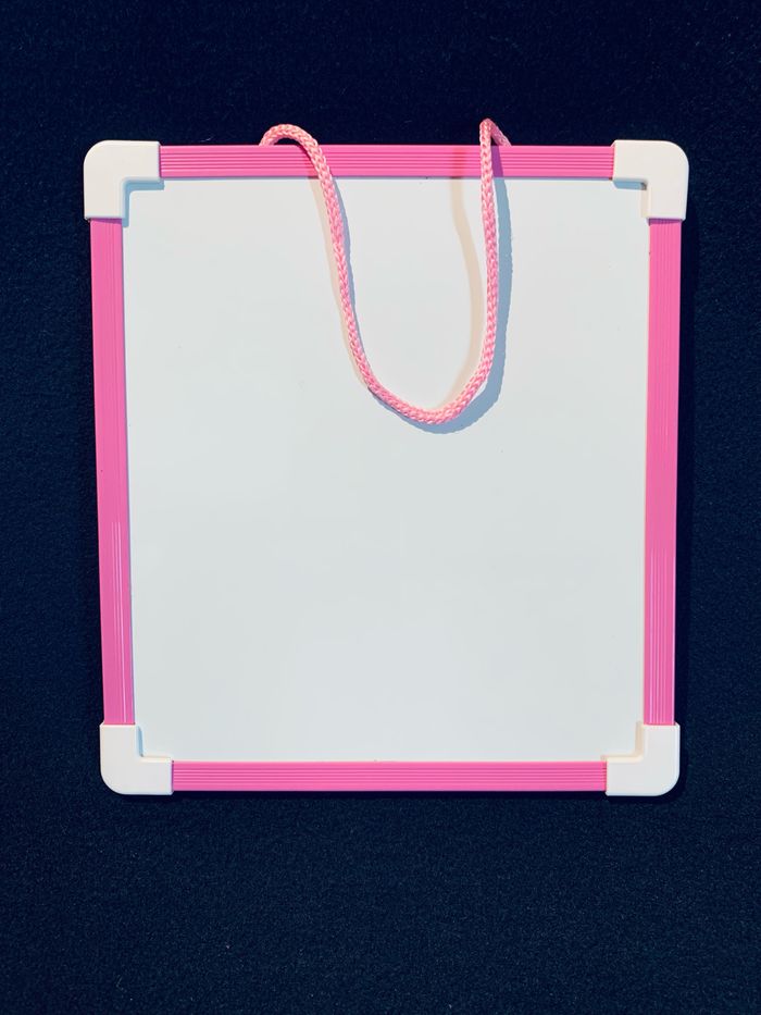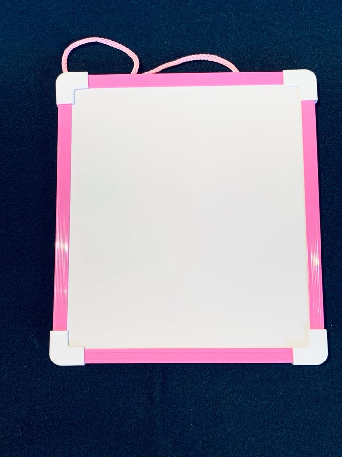 Ardoise effaçable blanche deux faces blanches, bord rose avec corde rose Dimensions : L20,5 x 18,5cm épaisseur 1cm Défaut sur les deux faces #ardoise #effaçable #feutres #loisirscreatifs #ecole #cc_accesoiresenfant #cc_loisircreatifs