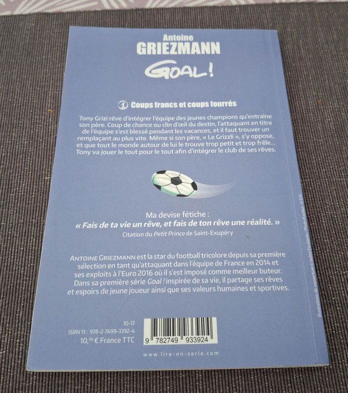 TOME 1 Livre pour enfants entre 8 et 12 ans selon éditeur. Il a été lu plusieurs fois mais est en excellent état (voir photos pour léger défaut couverture avant). ANTOINE GRIEZMANN est la star du football tricolore. Dans sa première série Goal ! inspirée de sa vie, il partage ses rêves et espoirs de jeune joueur ainsi que ses valeurs humaines et sportives. Prix neuf 10,95€ Regardez mes autres livres en vente sur mon dressing (vous pouvez acheter plusieurs tomes de cette série) et groupez vos achats pour profiter des remises paramétrées dès 2 articles achetés. Envoi rapide et soigné sous 24h maxi.