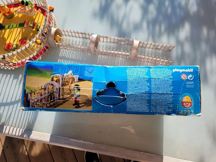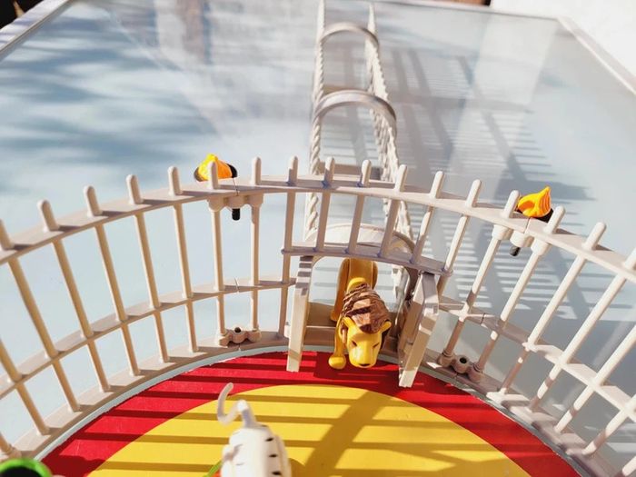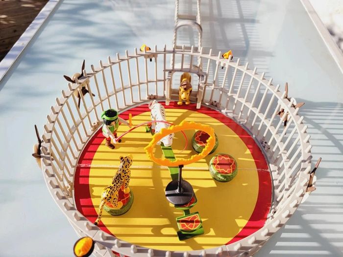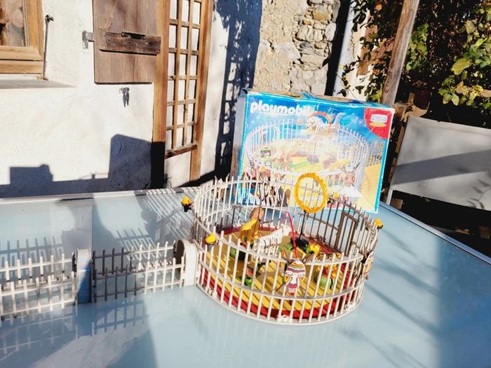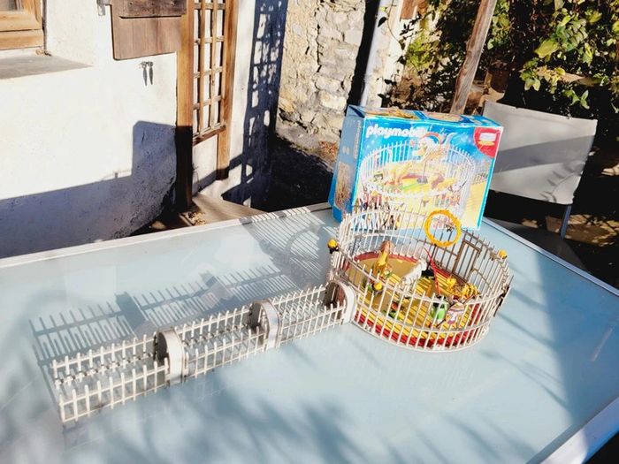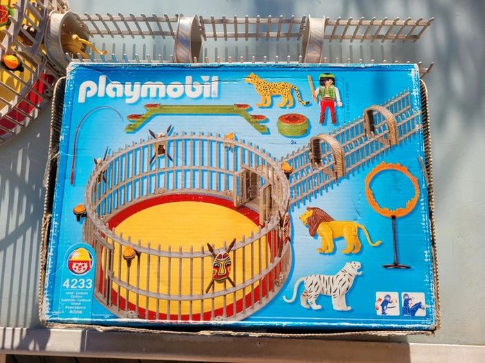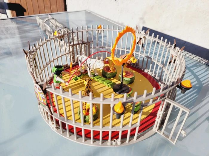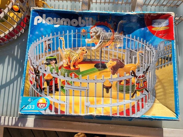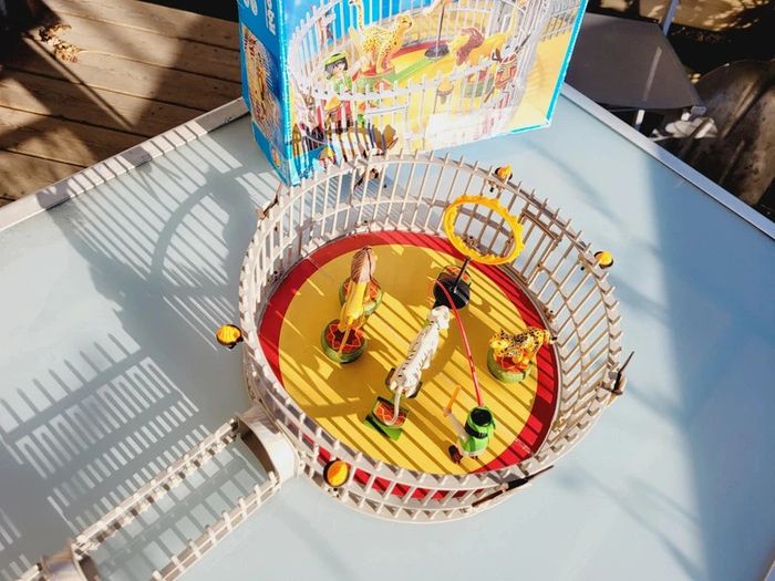 Avec 3 fauves et de nombreux accessoires. S'adapte sur la piste du cirque (Ref. 4230). Cage avec 3 fauves différents : lion, tigre blanc et léopard. Les animaux se tiennent sur la passerelle et les socles. La cage comporte deux accès : un par le tunnel pour les animaux et un autre pour le dresseur. Complet, sans notice....en excellent état interieur, seule la boite est bien abîmée Pour voir mes autres playmobils : #playmobilmooglou