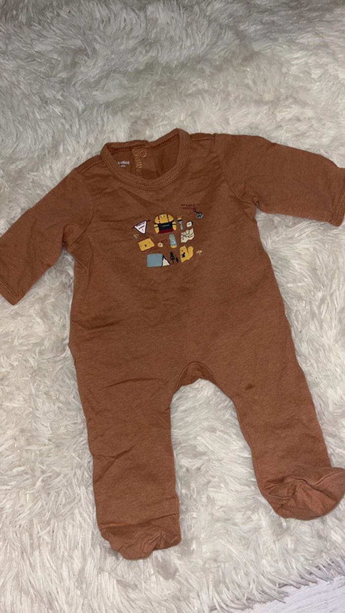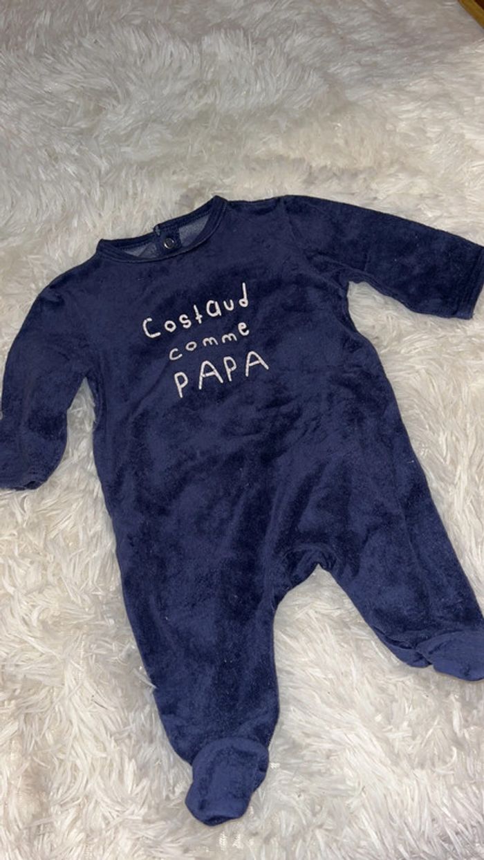 Ce lot contient : - un pyjama blanc matière pilou In Extenso 56cm - un pyjama bleu « costaud comme papa » Kiabi 1 mois - un pyjama marron Vertbaudet 1 mois