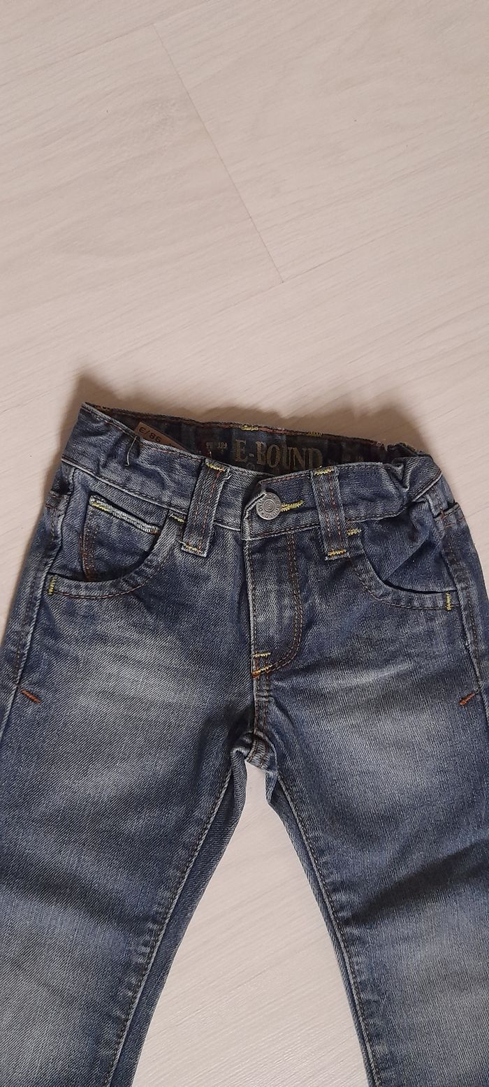 Jeans T 3 ans Marque E- BOUND Couleur bleu 3 poches devant 2 poches arrière Attache fermeture éclair/ agrafe et arrière élastique avec possibilité de resserrage 65% coton et 35% Polyester Très très bon état