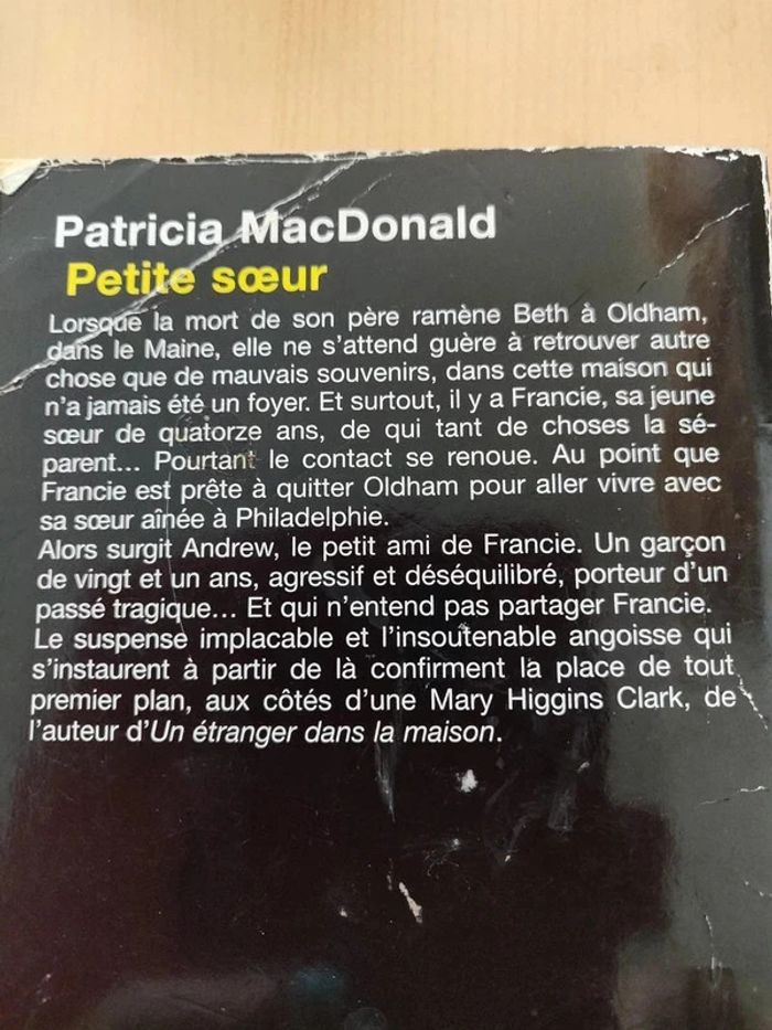 Patricia MacDonald nous embarque dans une intrigue palpitante. Un récit bien ficelé, qui nous plonge dans une course-poursuite entre Beth pour tenter de secourir sa jeune soeur prise dans les filets d'un malade mental au passé sulfureux, prêt à tuer père et mère pour atteindre son seul objectif: fuir avec Francie qu'il considère comme sa propriété absolue. 📣 Plein d'autres livres dont thriller etc via 👇 #angelotitou160304livresadultes 📢 Pensez aux lots ! Mes réductions sont activées dès deux articles #patriciamacdonald