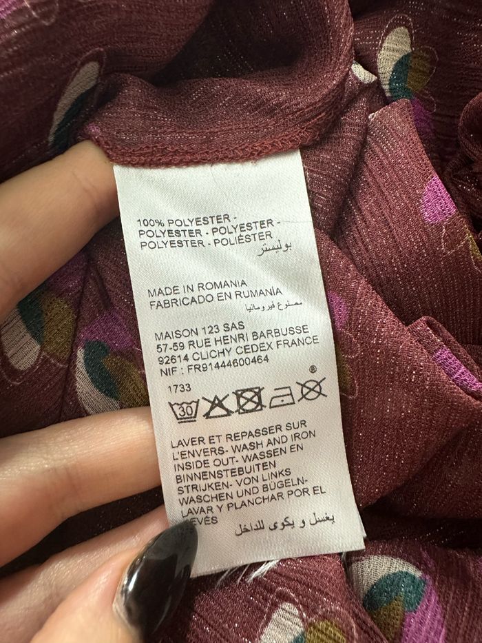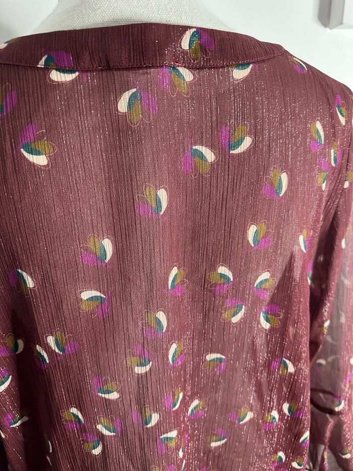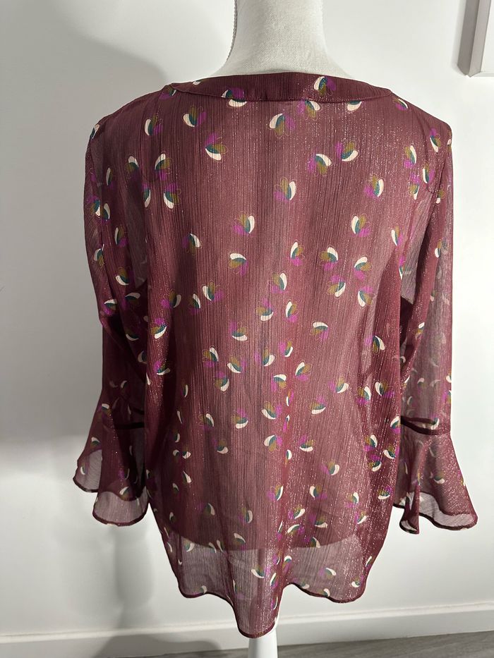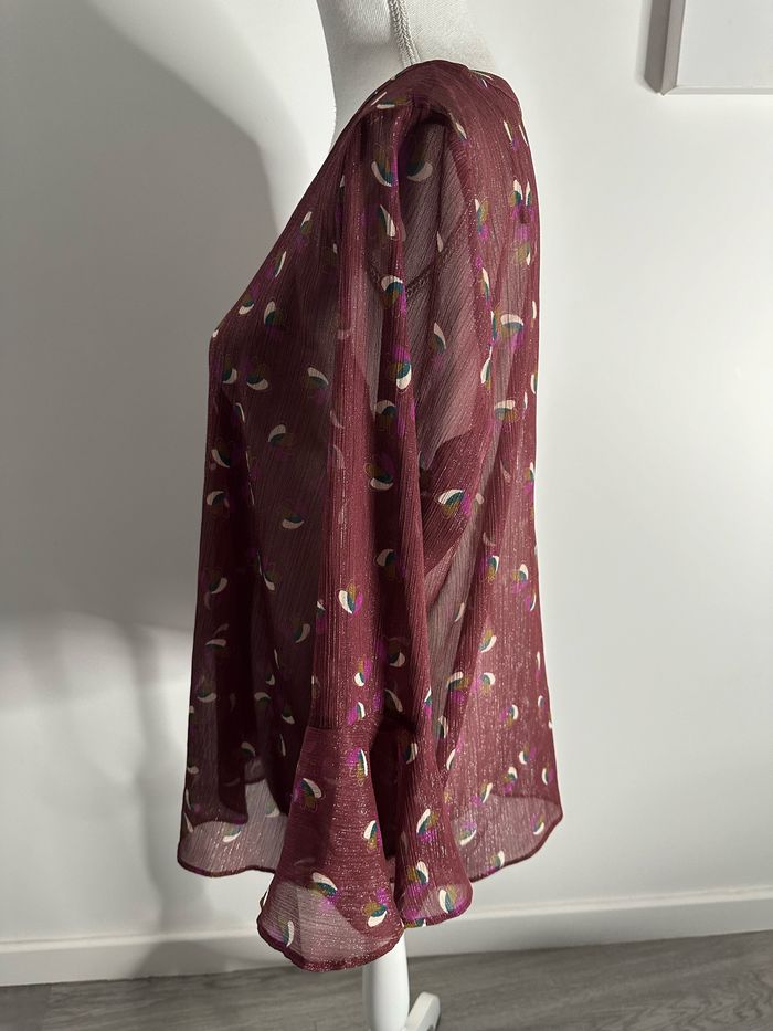 Blouse - Excellent état - Taille 44 équivalent XXL - Marque Maison 123 - Modèle Munich - Manches 3/4 - Bordeaux pourpre et dorée - Tissus transparent bariolé pailleté - Col en V - 100% Polyester - Prix d’achat: 79€ Dimensions: - 56cm niveau aisselles - 68cm de long